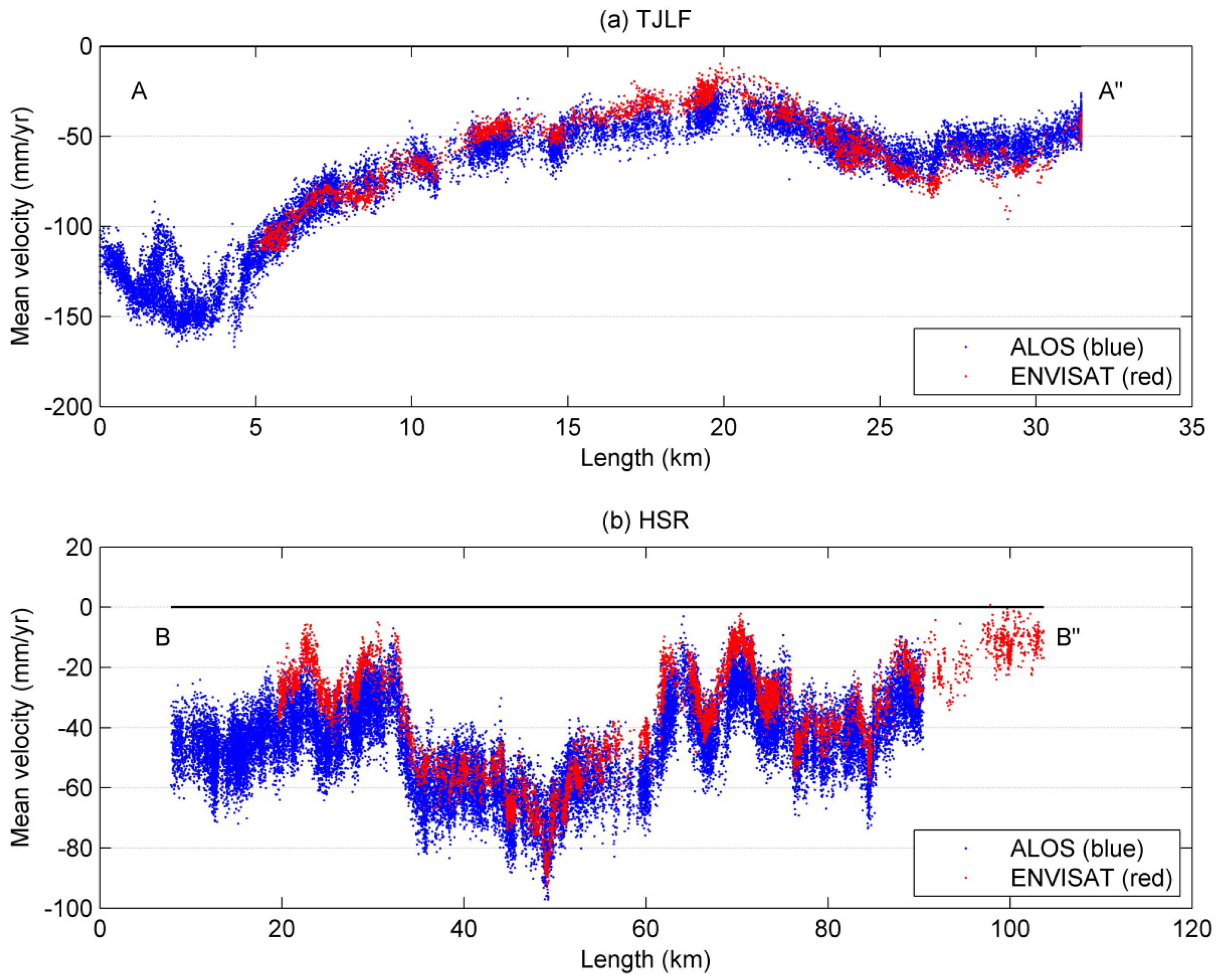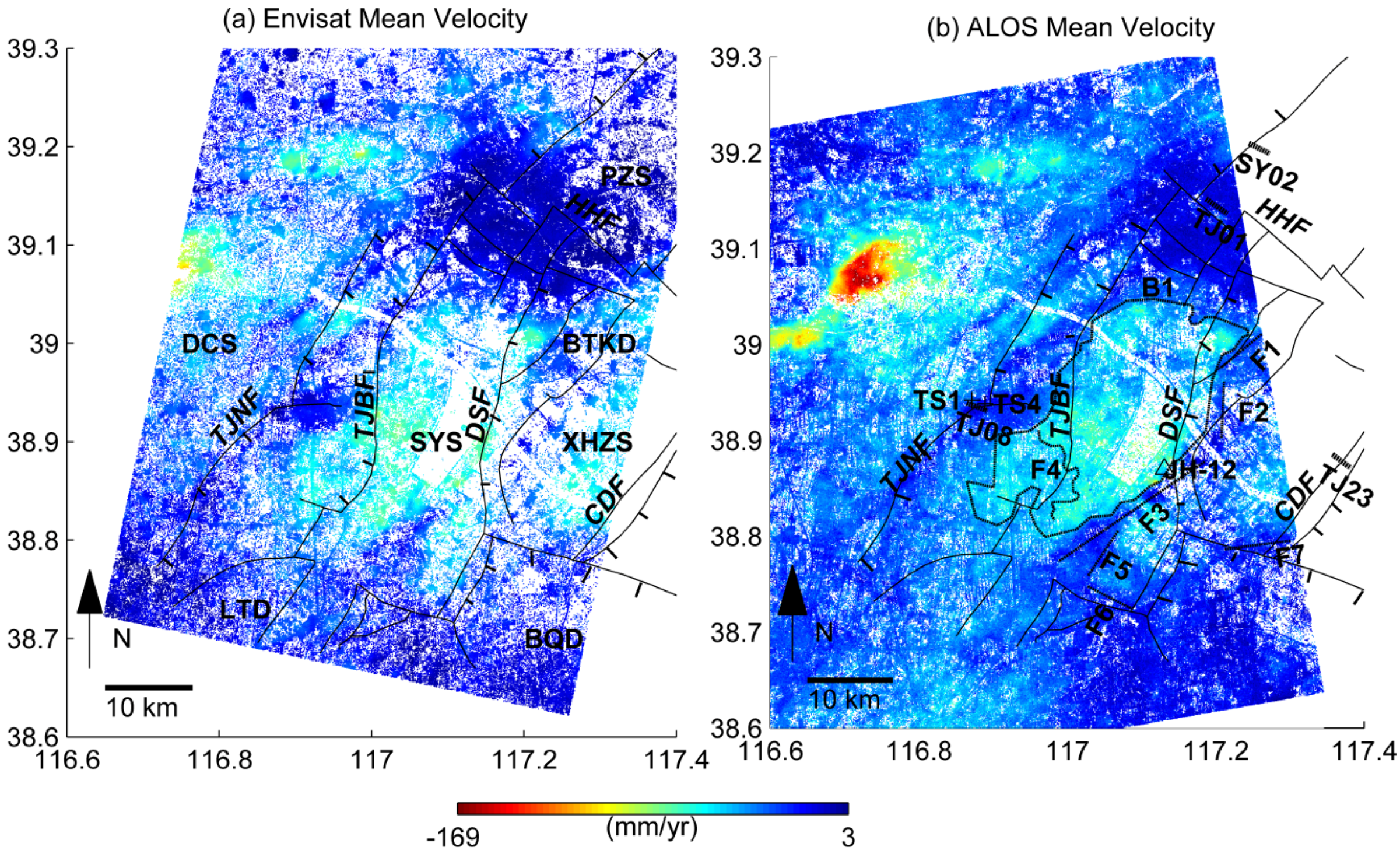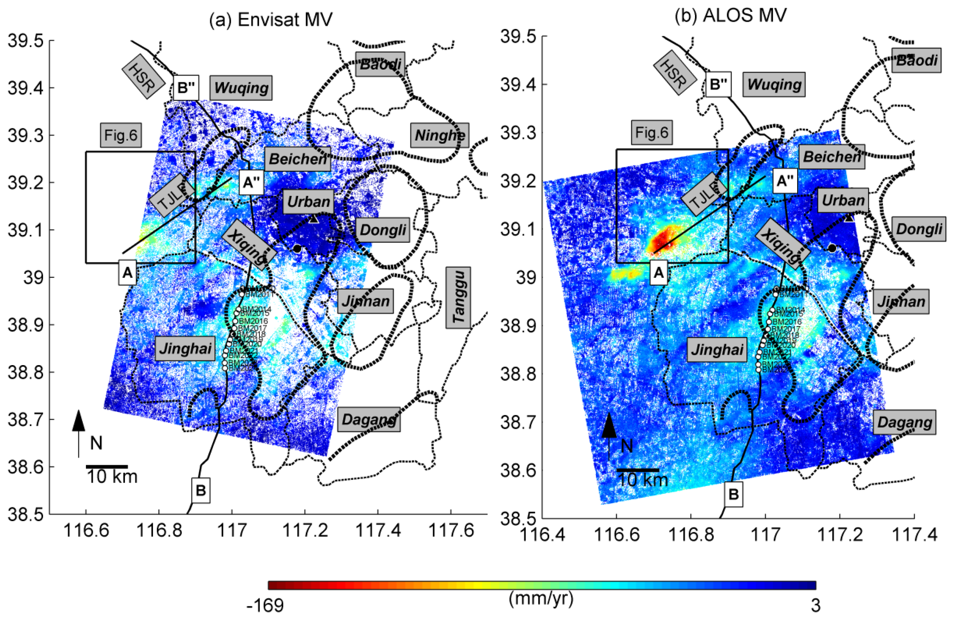 The west subsidence area is located between Tianjin and its northwest neighbor city Langfang. The velocity swath in the west subsidence area exhibits similar pattern between ALOS and ENIVSAT measurements (Figure 3a), which suggest that the mean velocities in the west subsidence area are reliable.