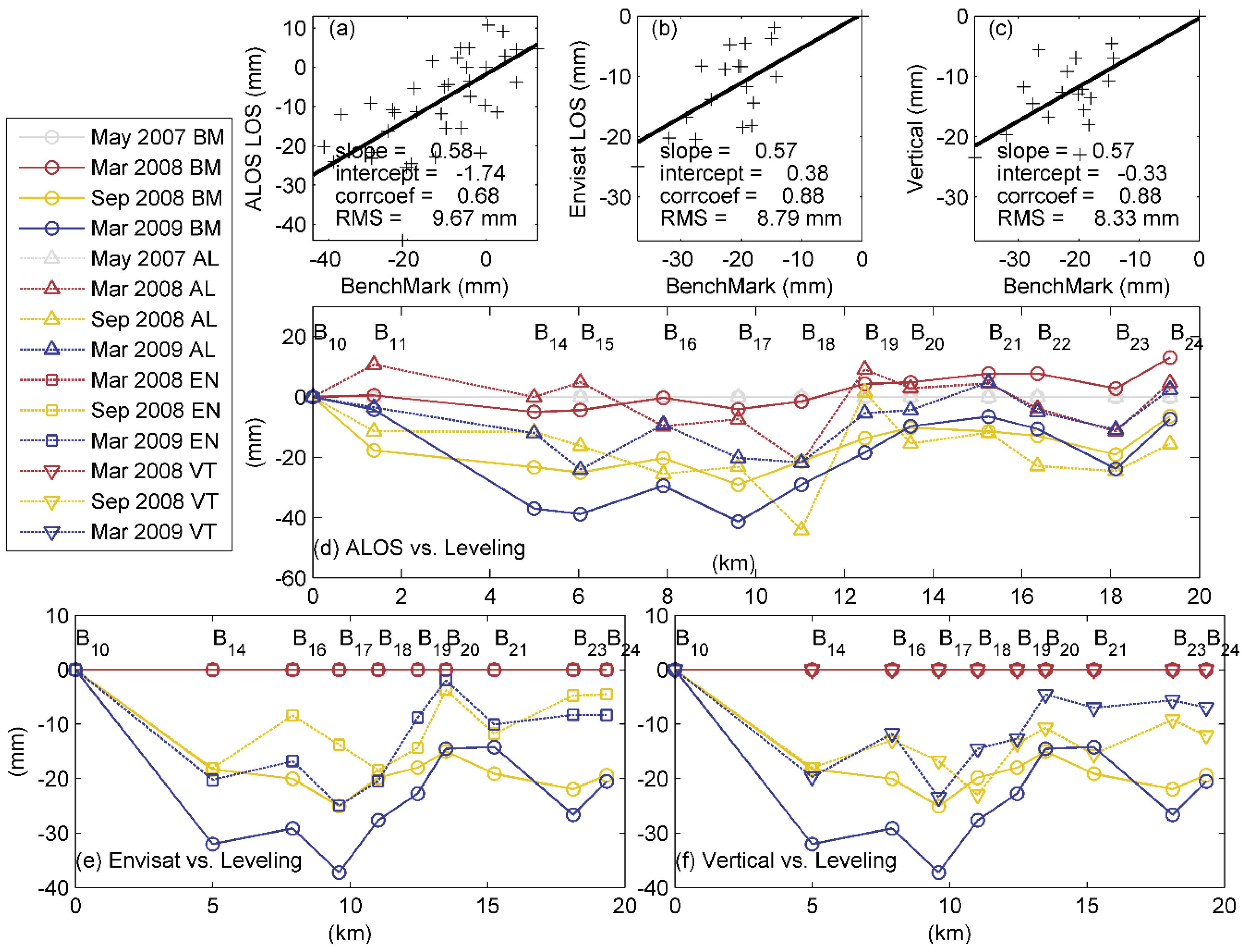 The RMS differences are 9.7 mm between ASAR LOS and leveling, 8.8 mm between PALSAR and leveling, and 8.3 mm between vertical component and leveling (Figure 4a–c). Slightly improvement is seen after decomposition of horizontal movement from vertical (Figure 4c,f). The reason lies in the fact that the accuracy of Leveling data, interpolated ALOS and Envisat displacement is limited. On the one hand, the accuracy of interpolated ALOS and Envisat displacement is limited by seasonal movement. For example, ALOS displacement on 1 March 2009 is interpolated from displacements of 22 January and 9 March 2009, while Envisat displacement on 1 March 2009 is interpolated from displacements of 27 February and 3 April 2009. The water level began to drop in late March, so the interpolated Envisat displacement is greater than ALOS in March 2009. It seems that the decomposition of horizontal and vertical movement is not highly effective in the presence of seasonal displacement. On the other hand, the leveling dates available are only accurate to months, and the first day of the month is assumed as the leveling date for a campaign. However, it still can be seen that interpolated ALOS and Envisat displacements generally follow the displacement trend of benchmarks, although with less displacement (Figure 4d,e). It is likely that the vertical displacement is dominant to horizontal displacement along the leveling line, and the projection from vertical to LOS results in displacement reduction for both ascending and descending tracks.