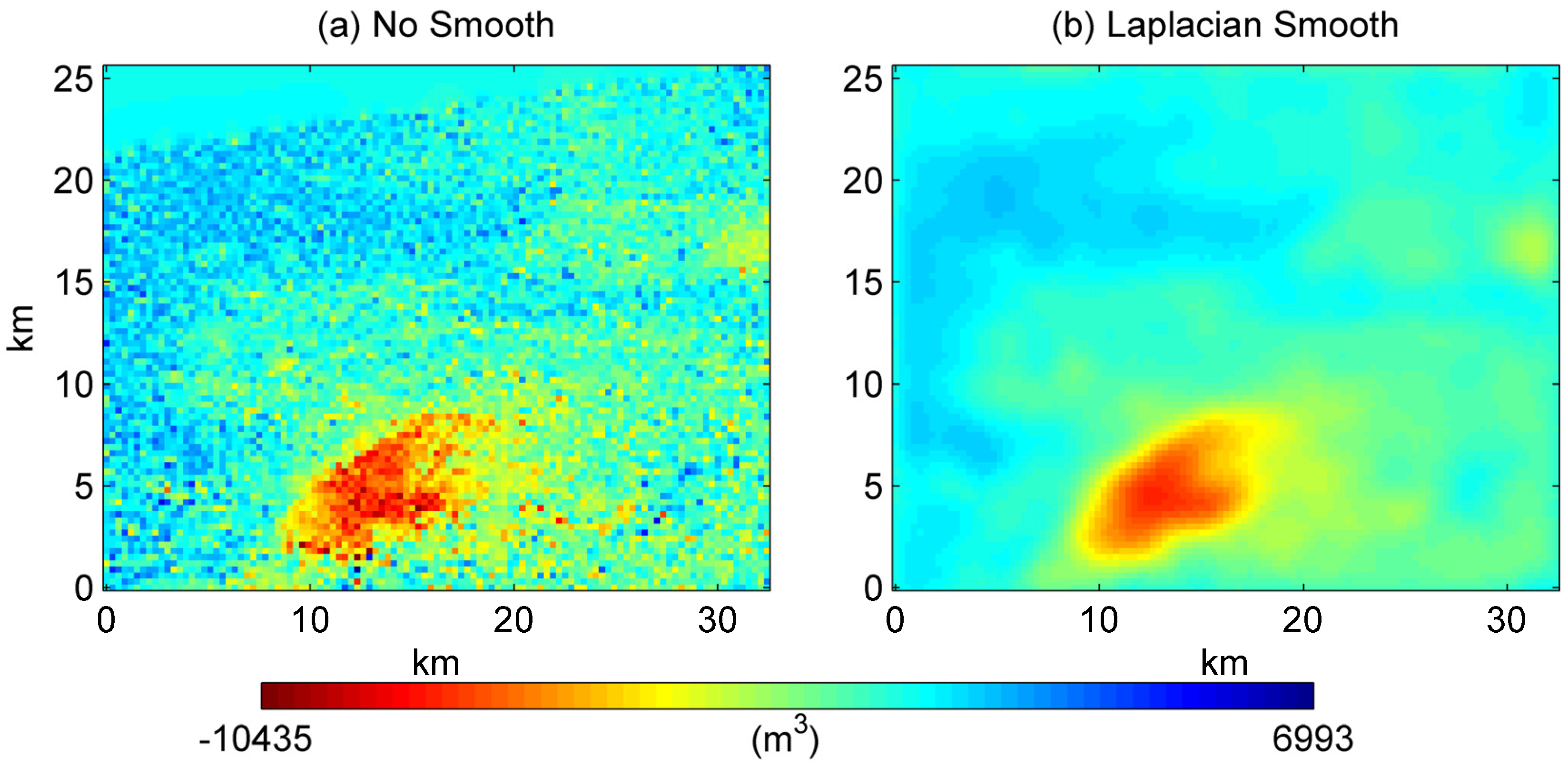 In the process of inversion, regularization on the source strength is often needed to ensure a reliable inversion with a faithful representation of the source. Directly modeled reservoir volume changes (Figure 5a) seem noisier than the regularized source (Figure 5b). This can be caused by displacement uncertainty due to noise and other error sources. Besides, the semi analytical approach allows approximation of reservoir change and efficient computations, but it does not assure the physical process that must involve a continuous contracting/inflating volume. A Laplacian regularization based process was applied to smooth the source (Figure 5b).