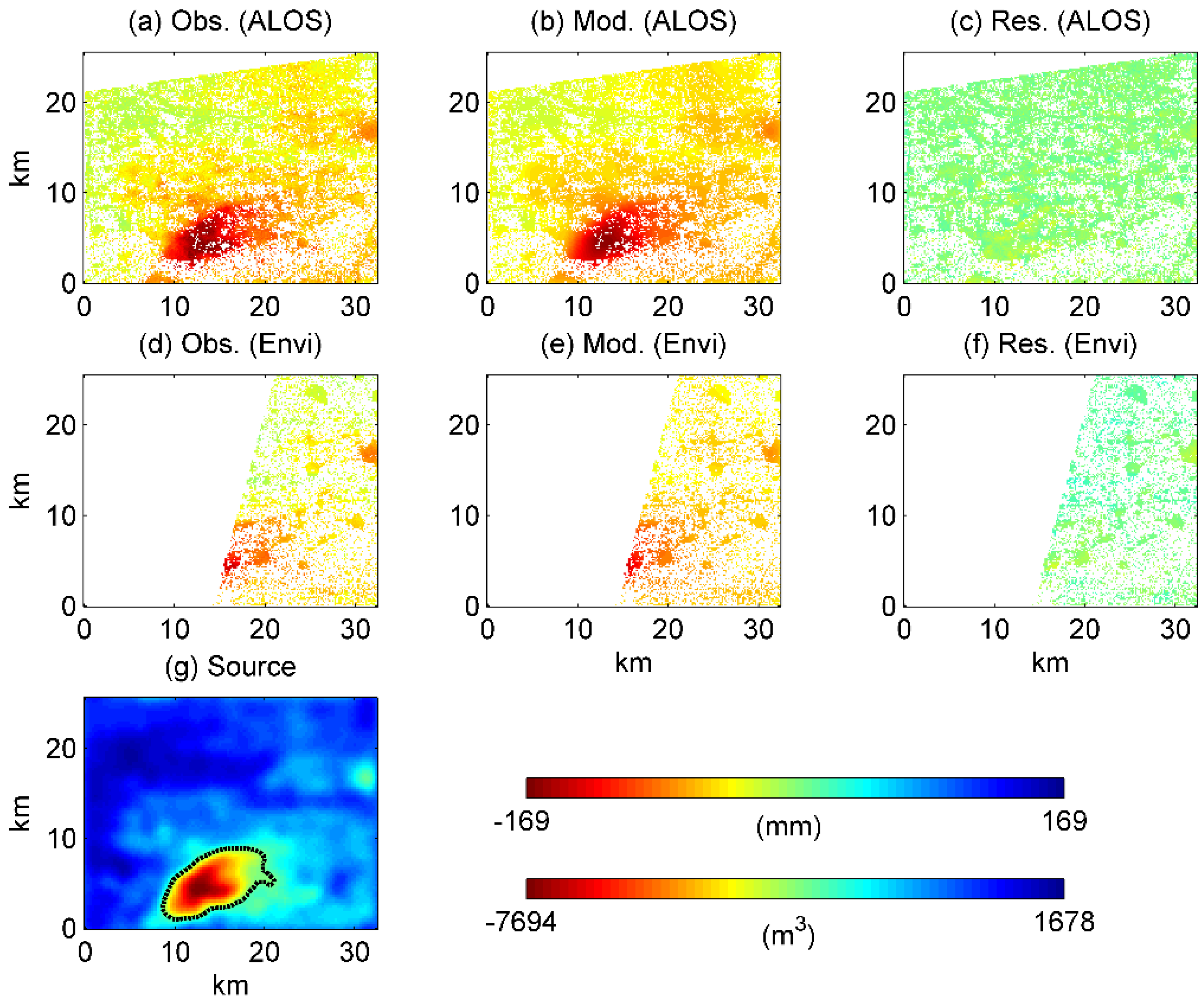 (a) ALOS LOS annual displacements (annual rates times one year); (b) modeled ALOS LOS annual displacement; (c) residuals between observed and modeled displacements for ALOS; (d) Envisat LOS annual displacements; (e) modeled Envisat LOS annual displacement; (f) residuals between observed and modeled displacements for Envisat; and (g) modeled Source array volume changes from ALOS displacement. Dashed line is a contour of −2700 m3.