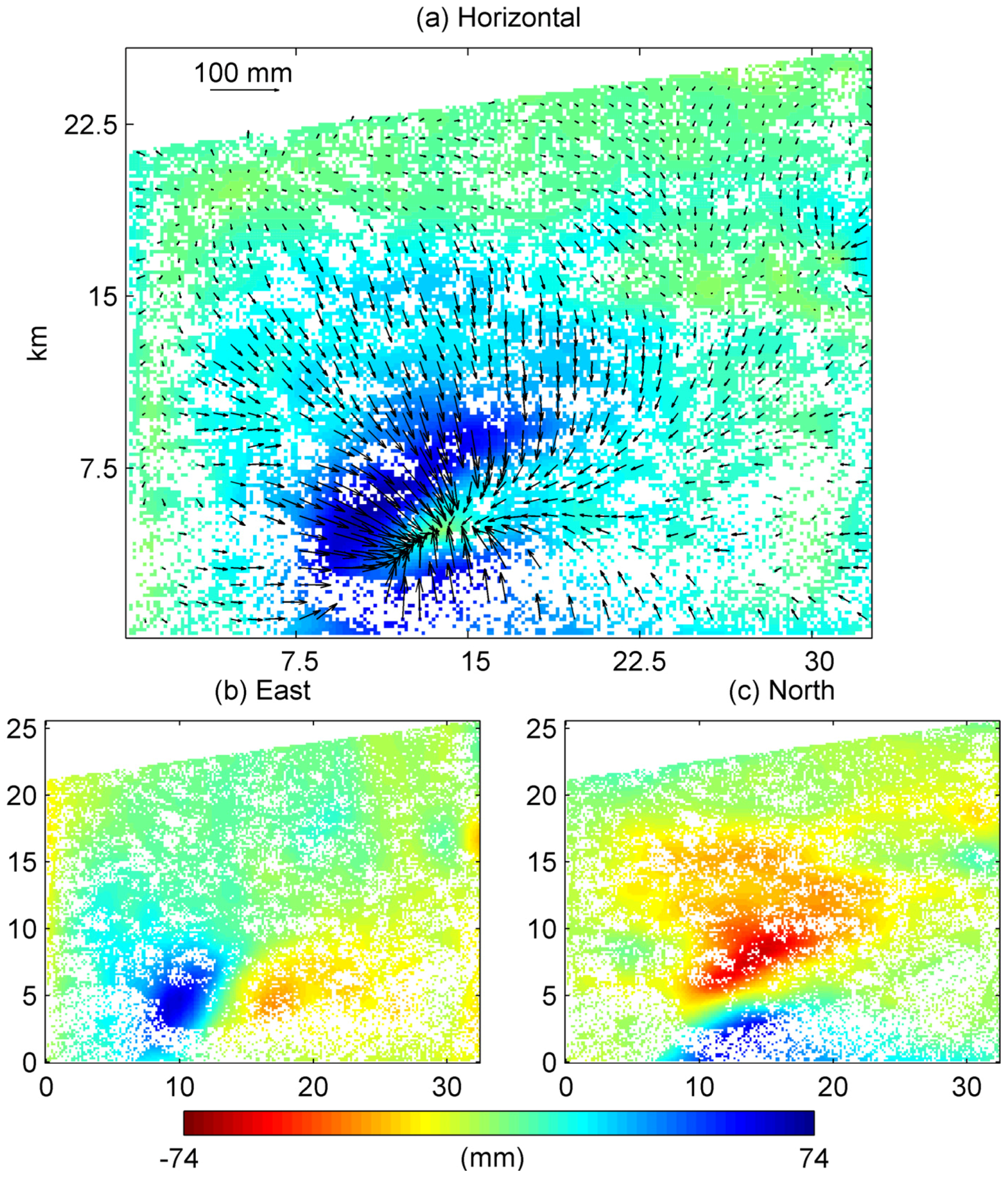 where is the horizontal green/influence function. Modeled horizontal displacements can be substantial, with maximum annual horizontal displacements reach up to 74 mm (Figure 8). Maximum horizontal displacements are located along a semi closed oval around the modeled source center. The modeled maximum horizontal displacement is 36% of the maximum vertical displacement. Theoretical ratio of maximum horizontal to maximum vertical displacement is 38% for a single Mogi source [51]. A field based aquifer test in Nevada shows that the horizontal displacements reach 8 mm and vertical displacements reach 12 mm within the first 22 days of pumping before reaching the steady state pumping [52]. Thus, the horizontal displacement induced by aquifer abstraction can be significant. Horizontal displacements are believed to be a cause of ground fissures [53]. Ground fissures associated with subsidence has caused severe infrastructure damage in Taiyuan Basin of China [54]. Hence, it is worth measuring the horizontal displacements due to ground water depletion, including Tianjin.