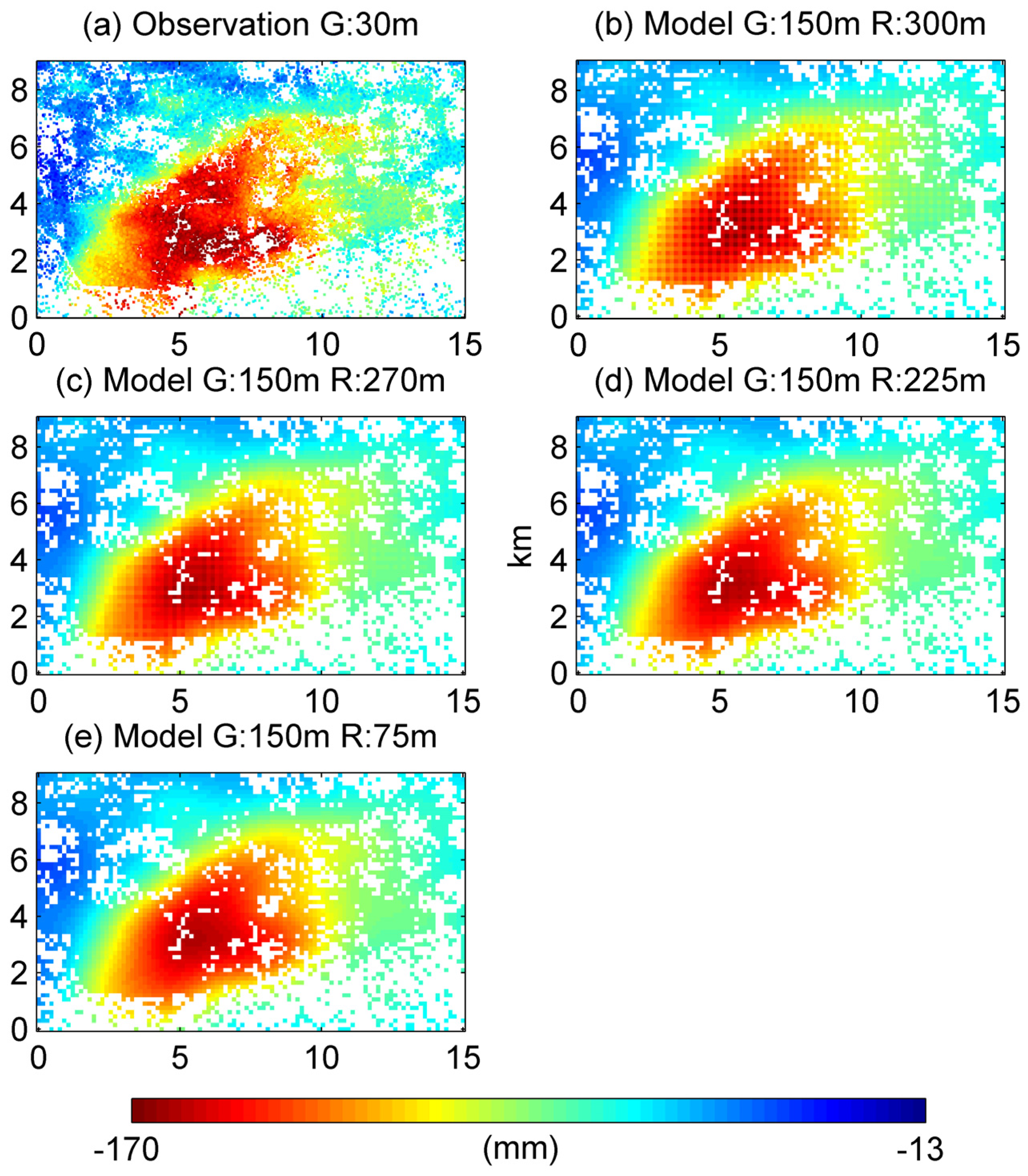 Grid-like patterns stand out in the modeled displacement (Figure 9b). The hypotheses that these are related with reservoir grid size are examined. The 300 m reservoir is now resampled into 270 m, 225 m, and 75 m grids (Figure 9c–e). At the same time, reservoir volume changes are resampled by size to fit the surface displacement. It can be seen that surface displacements are well represented when finer reservoir grids are adopted without alternating surface grid size. Hence, the grid patterns that obscure the modeled displacement are mainly due to the reservoir grid size in this case.