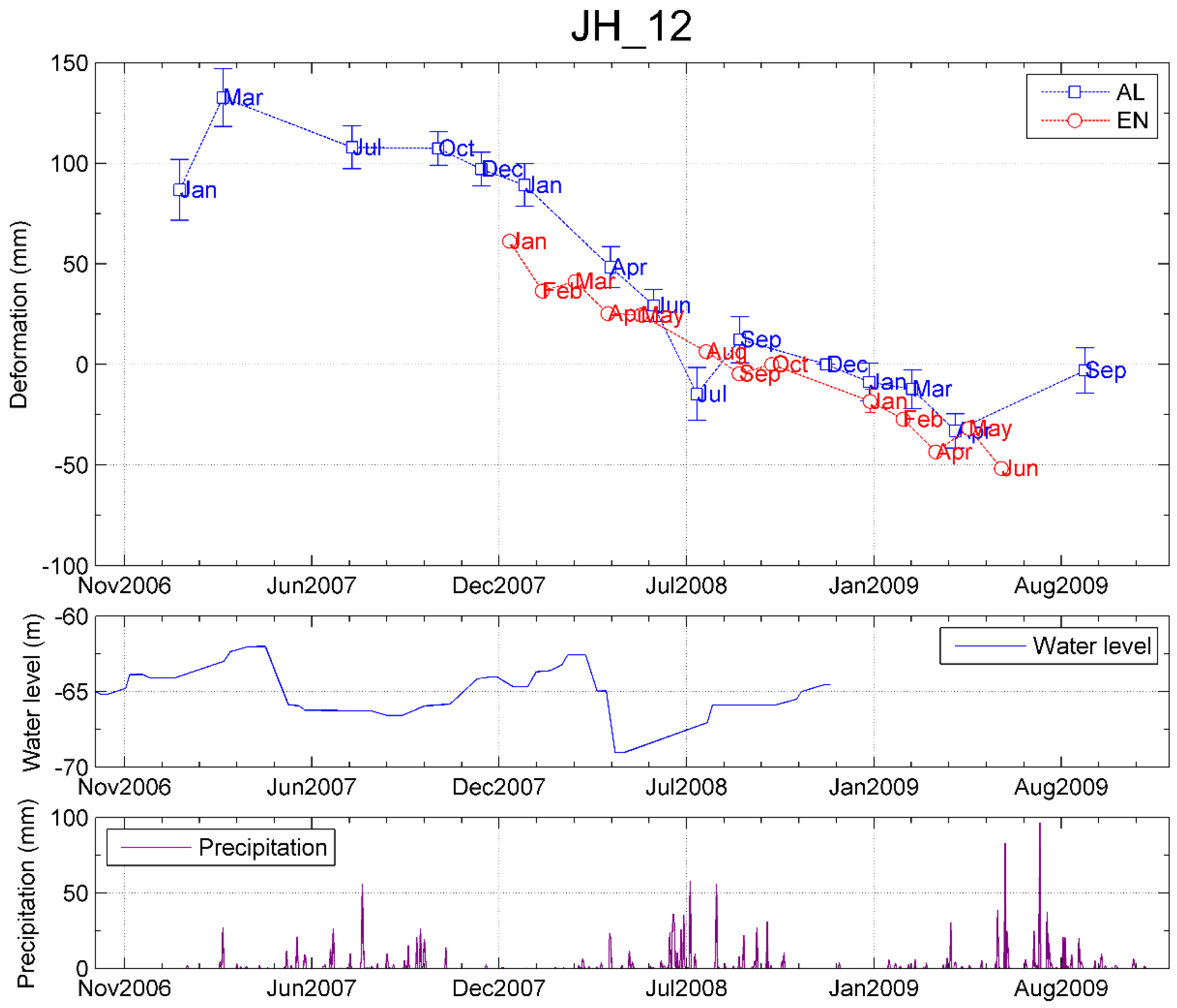 Envisat and ALOS LOS displacement at JH-12 Well (the triangle in Figure 12b) in east subsidence area. Precipitation data are available from China Meteorological Administration, specifically meteorology station No. 54527 in Tianjin [65]. Water level of JH-12 Well in Aquifer II is available to the end of 2008 [27].