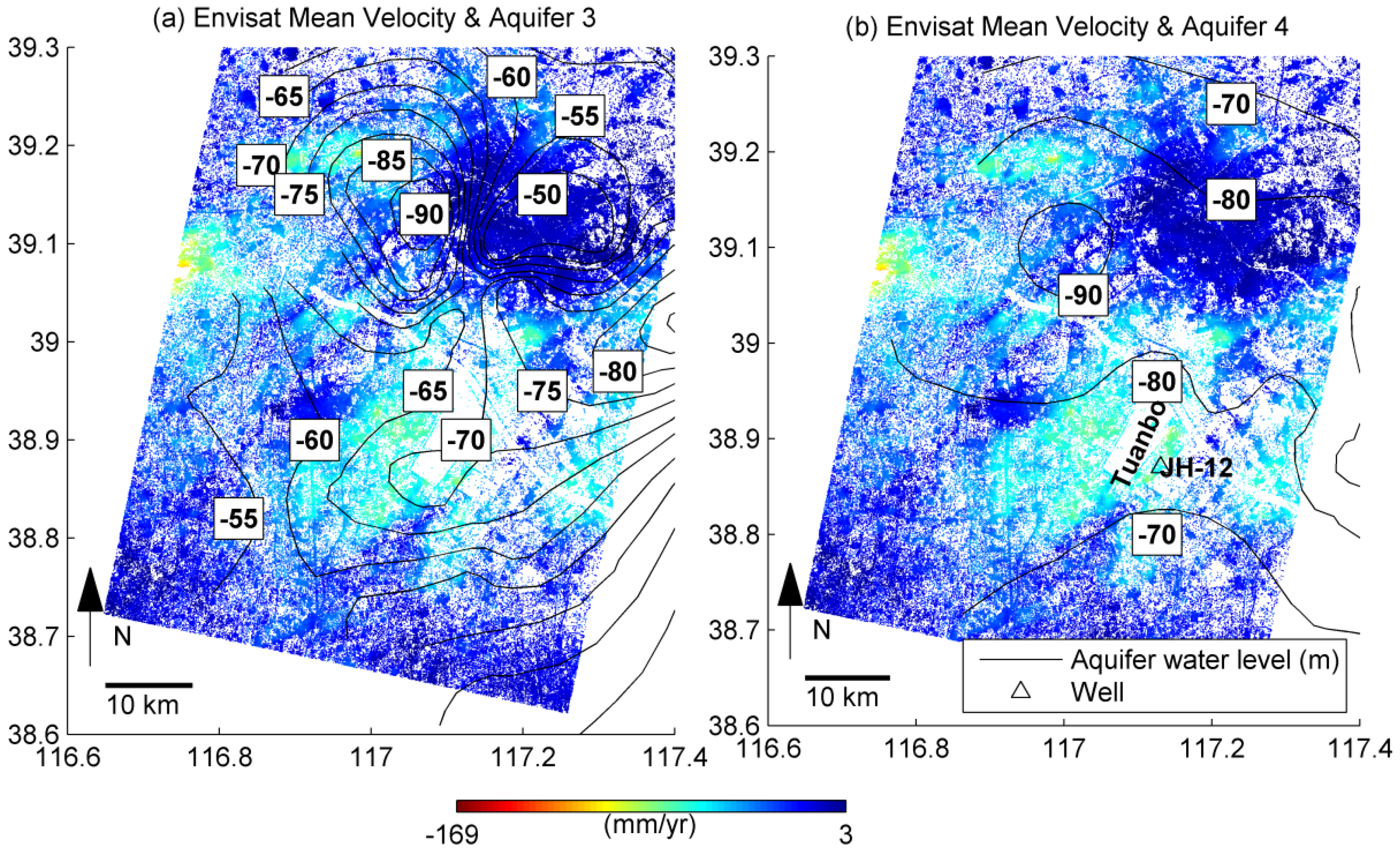 Water levels in 2008 superimposed on LOS subsidence rates from Envisat (4 January 2008 to 12 June 2009): (a) Aquifer III; and (b) Aquifer IV. Location of JH-12 Well is marked in triangle. Tuanbo Reservoir is labeled.
