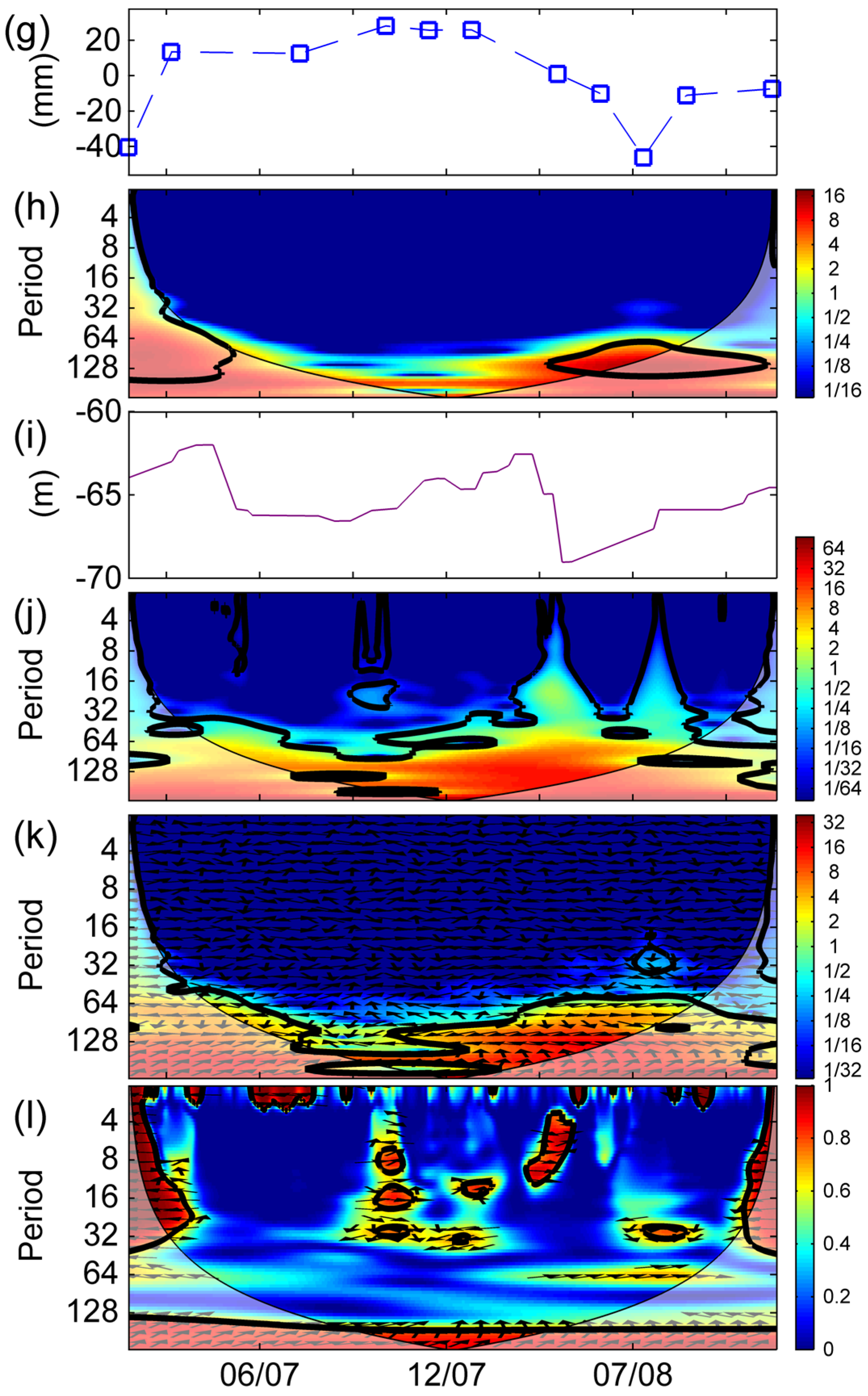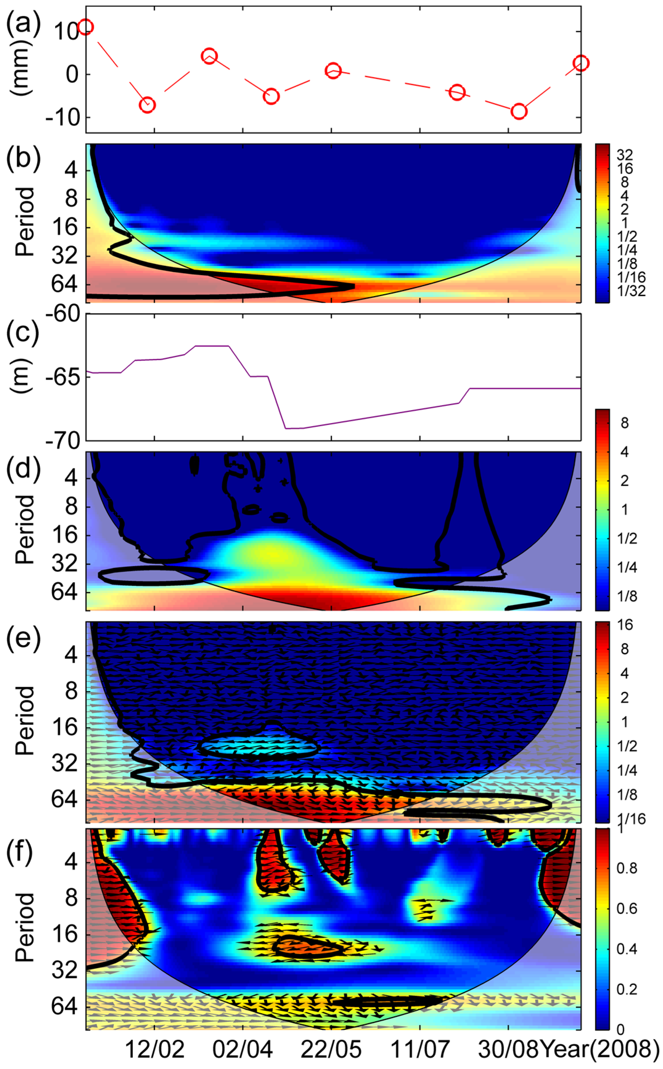 Common interval for Envisat displacement and water level time series is between 4 January 2008 and 10 October 2008. Linear component of Envisat displacements is estimated by least square method and subtracted from the time series. The Envisat image number is limited to eight, and down sampling of water level time series at image acquisition time results in very coarse power spectrum. Oppositely, the non-linear component of Envisat displacement is over sampled by linear interpolation at water level time. However, the interpolation also reduces the accuracy of displacements. Envisat time series show a two-month cycle (64-day period) between April and May 2008 from CWT analysis (Figure A1b). No effective cycle can be observed for water level time series (Figure A1d). XWT analysis shows a phase rotation from about 120° out of phase in the one and half month cycle (48-day period) to about 120° in phase in the two month cycle (64-day period) between April and May 2008 (Figure A1e). Abrupt phase changes occur between adjacent 48-day band and 64-day band. This implies strong seasonal variations in a short time. It corresponds to the quick water level drop in April. WTC analysis shows about 90° out of phase in cycles of 4–8 days and 16–32 days (Figure A1f). It means the displacement leads water level by 1–2 days or 4–8 days. Actually, this is due to lower temporal resolution of Envisat images compared with water level time series. The lowest water level is between the 4th and 5th Envisat image acquisition time, so it looks as if displacement from 4th to 5th image happens before the water level rise. In fact, the 4th image corresponds to a water drop stage while the 5th image corresponds to a water rise stage.