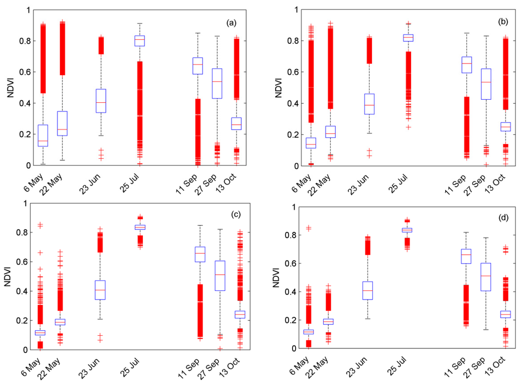 Boxplot for corn Normalized Difference Vegetative Index (NDVI) values in 2003: (a) original data for all corn pixels within the region; (b) after applying the first filter: edge-of-field pixels are removed; (c) after applying filter 2: pixels without sufficient seasonal variation are removed; and (d) after applying filter 3: between images from 22 May and 23 June. Pixels with decreasing NDVI values between the two dates were removed. The third filter was also applied between images from 25 July and 11 September. Pixels with increasing NDVI values between two dates were removed.