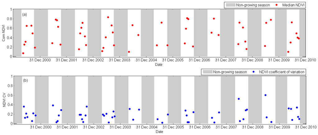 Figure 4a illustrates the median growing season corn NDVI values for 11 years of images (2000–2010). The median value of corn NDVI follows the expected phenology of the corn canopy. In the early growing period, as corn plants emerge, vegetation coverage per unit area is small, and the median NDVI value is low (0–0.2). As plants develop, the NDVI value grows rapidly (0.3–0.6) capturing the increase in leaf area as the growing plant spreads to cover the soil between the rows in the fields. The NDVI value is proportional to the canopy coverage during this stage. Corn NDVI reaches a peak value (0.7–0.8) at the end of July or early August, at the stage when all leaves are fully developed. As plants enter the end of the reproductive stage and natural senescence occurs, NDVI decreases significantly.