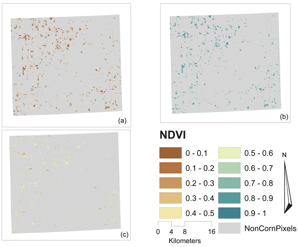 Three additional filters are applied to further refine the selection of corn pixels identified by the CDL data, to minimize the potential for mixed pixels and registration errors that can introduce noise into the data. The first filter improves the identification of pure corn pixels by removing any pixel that had more than one non-corn neighbor. These are assumed to be edge-of-field pixels with a greater likelihood of being mixed. The second filter checks for a minimum amount of change in NDVI between planting and silking when NDVI should peak., Here the median NDVI value for all corn pixels was calculated for all images for a year, and the image with the peak median NDVI (near silking stage) and minimum NDVI (near planting) were identified. The difference between median NDVI for those two images was set as a threshold. Any pixel with maximum NDVI range less than that threshold over all images in the year was excluded. The final filter checks that NDVI increased monotonically from planting date to peak NDVI stage, then decreased monotonically from peak stage to maturity stage. Due to the limited availability of images each year, the maximum NDVI value calculated from the Landsat images may not always be the peak NDVI for that year. It is possible to have a non-monotonic change for valid pixels if the peak growth period is missed due to the lack of available imagery. Therefore, the monotonic check is applied for images between the latest planting date and earliest silking date, and images between the latest silking date and earliest maturity date, where these dates have been extracted from the USDA NASS Crop Progress Reports (Table 2). Since 2004 had only three available images, the third filter was not applied. Figure 2 illustrates the impacts on NDVI after each of these filters.
