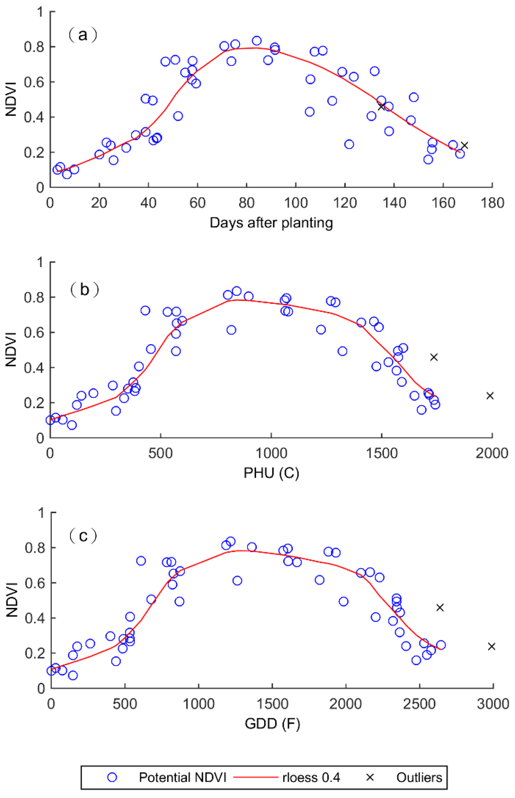 Generation of normal NDVI curve based on 11 years data versus: (a) days after planting; (b) Potential Heat Units (PHU); and (c) Growing Degree Days (GDD). The normal curve is generated by smoothing NDVI using robust loess method, with a span of 40%.