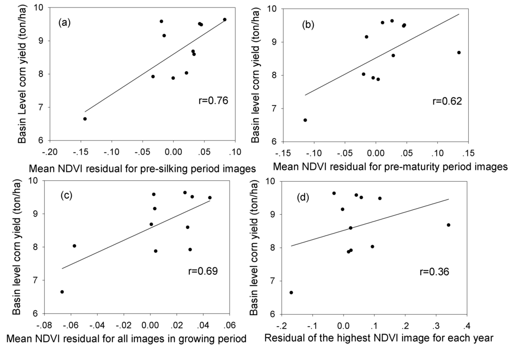 The relationship between basin level corn yield and (a) mean NDVI residual for pre-silking period images; (b) mean NDVI residual for pre-maturity period images; (c) mean NDVI residual for all images in the growing period; (d) residual of the highest NDVI image for each year. Residuals are calculated based on GDD.