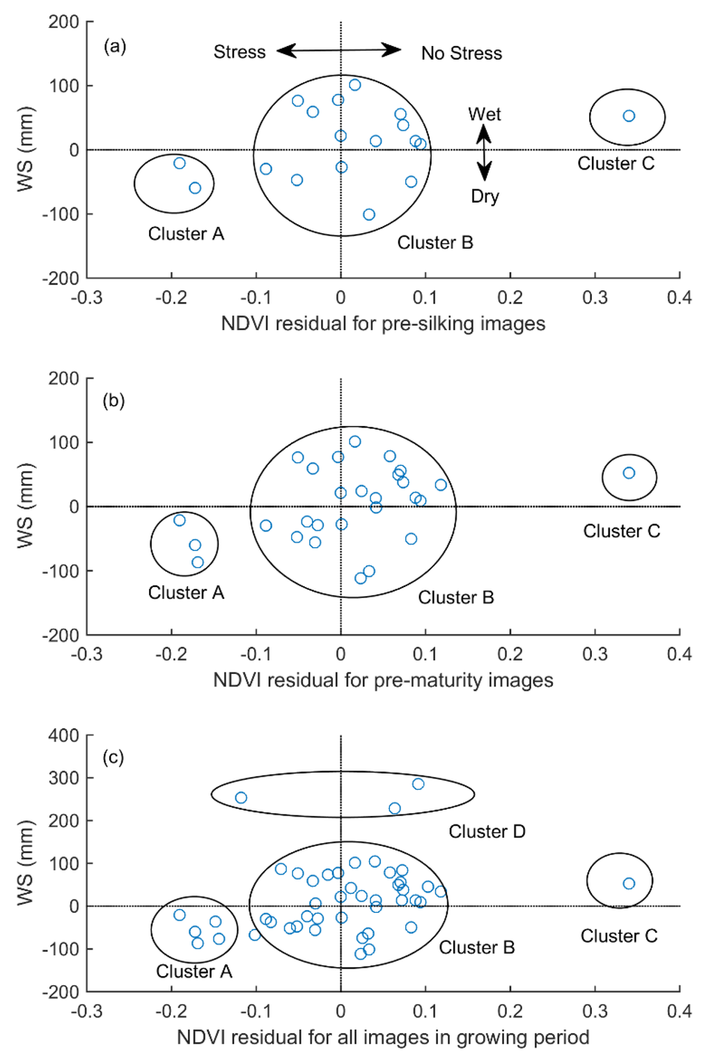 The relationship between NDVI residuals and water stress (ws) is shown in Figure 9. Large negative values of water stress (ws) represent dry conditions; positive ws represent wet conditions. There are no strong correlations found in the data (Figure 9), but it appears that points can be grouped into several clusters. Image averages in Cluster A have both negative NDVI residual and water stress, which indicates that the weather is dry and crop growth is below normal. Cluster C has both positive NDVI residuals and water stress, so precipitation and crop growth are both above normal. Images in Cluster B represent normal weather and crop conditions. Compared to Cluster B both cluster A and C have relatively larger absolute values (0.2–0.4) in NDVI residuals, indicating larger growth discrepancies (could be either under or above normal condition). When corn growth is way above or below normal, it is usually associated with extreme climate conditions. Images in cluster B do not have a clear relationship between water stress and NDVI residuals. Since crop growth can be affected by many environmental factors, for example, soil types and slopes, temperature, disease and pests, leaf growth in this cluster may not respond to water stress exclusively, but is influenced by other environmental factors. Figure 9c also has a fourth cluster, named Cluster D, that contains images collected from the end of the growing season (after middle September) in 2003. Images in this cluster have very large positive ws values, but an unclear relationship between ws and NDVI residuals. This indicates that an oversupply of rainfall at the end of the growing season did not have a substantial effect on crop development. NDVI residuals at that time are more strongly related to the natural senescence process than water stress.