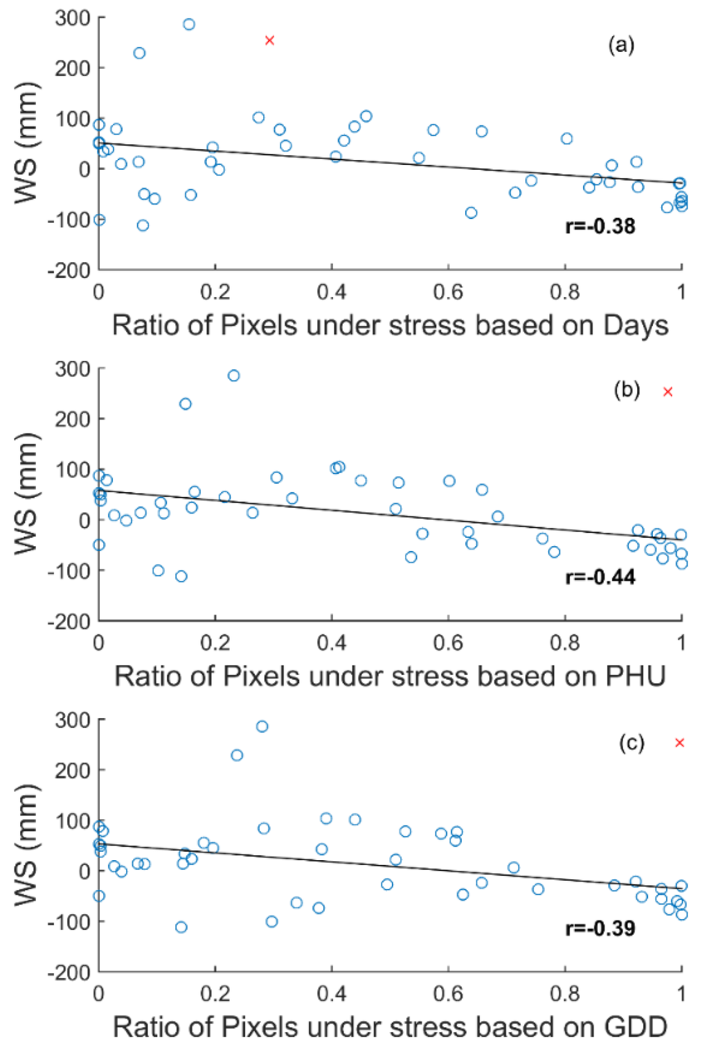Relationship between water stress and risky pixel rate based on (a) days; (b) PHU; (c) GDD. Red cross indicates the outlier at the very end of the growing season (13 October) in wet year 2003.