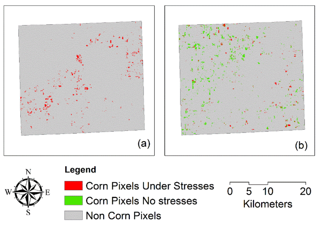 Spatial distribution of corn pixels identified as being under stress and experiencing no stress (using the GDD based normal curve) in De Kalb County: (a) 2002 dry year; and (b) 2003 wet year.