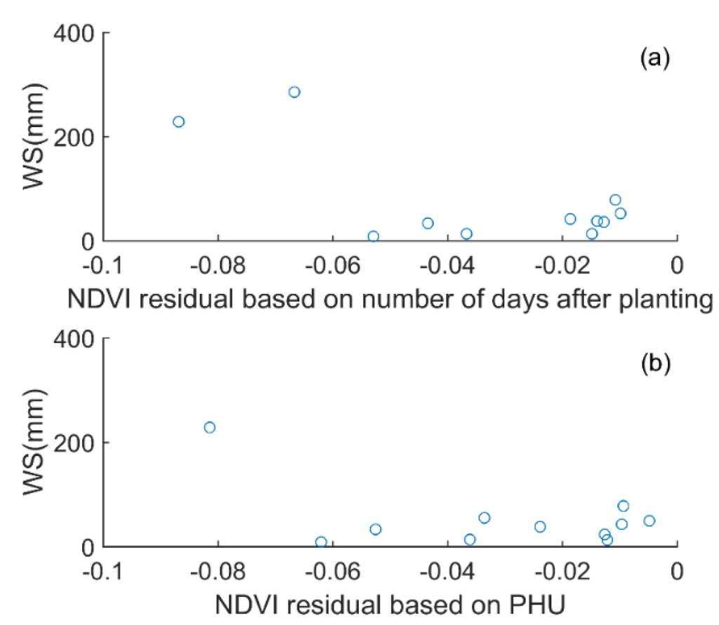 For wet years, although fewer cells are affected by stress (risky pixel rate < 0.2), the potential yield loss in those cells with high stress rates could be huge. This is investigated using NDVI residuals that can represent potential yield, and ws, for risky cells (negative NDVI residuals) only when the risky pixel rate is less than 0.2, and ws > 0 (Figure 12). Though there is no clear relationship between ws and the NDVI residuals, in Figure 12a, we found that very large ws values (ws > 200 mm, both found in 2003) are always associated with large negative NDVI residuals, indicating potential yield loss in those cells. The overall yield in 2003 for the study area was the 3rd highest in the 11 year period (2000–2010), which means that yield losses in those few cells where water stress was high are compensated by increased yield in other cells that benefitted from sufficient rainfall.