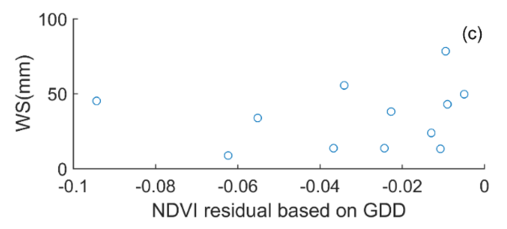 Relationship between ws value and NDVI residual based on (a) number of days after planting; (b) PHU; (c) GDD for risky cells when risky pixel rate is below 0.2.
