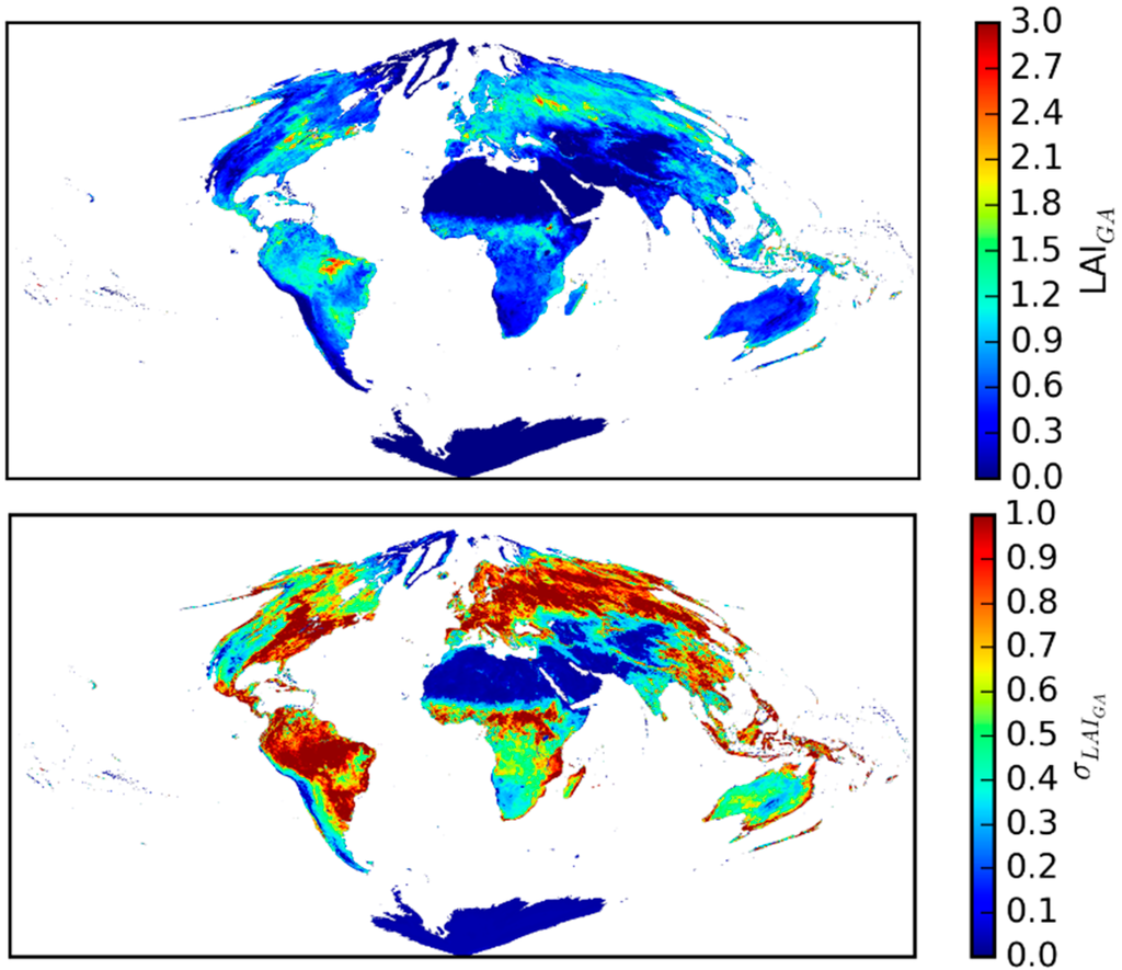 The JRC-TIP GlobAlbedo approach results in values of LAI (and derived fAPAR) that are consistent with the 1D approximation to a 3D RT problem, where clumping is not accounted for, but not intended to correspond to the real LAI and fAPAR of the surface. This approach is useful for the following reasons: (i) consistency between RT model assumptions and observations is ensured; (ii) meaningful uncertainty core to the GlobAlbedo approach and is provided with the derived LAI and fAPAR values; (iii) the inversion scheme can be applied globally, without any requirement for any biome-specific structural (cover, clumping, understory) assumptions required for 3D RT model approaches; and (iv) the RT scheme is very similar to schemes used by many Earth System Models (ESMs) [22]. However [43] note that even 1D RT schemes used in ESMs are often implemented differently, leading to differences in both fAPAR (and hence photosynthesis) and surface albedo.