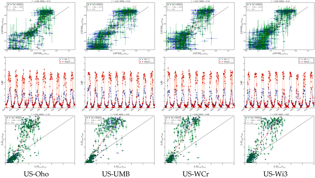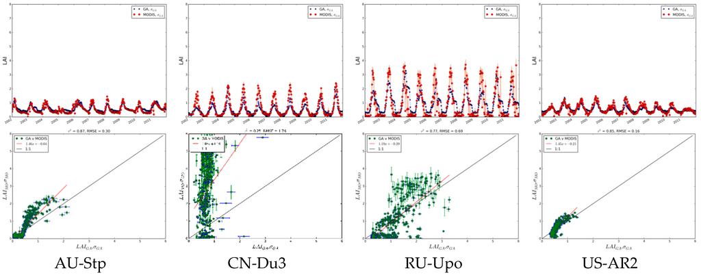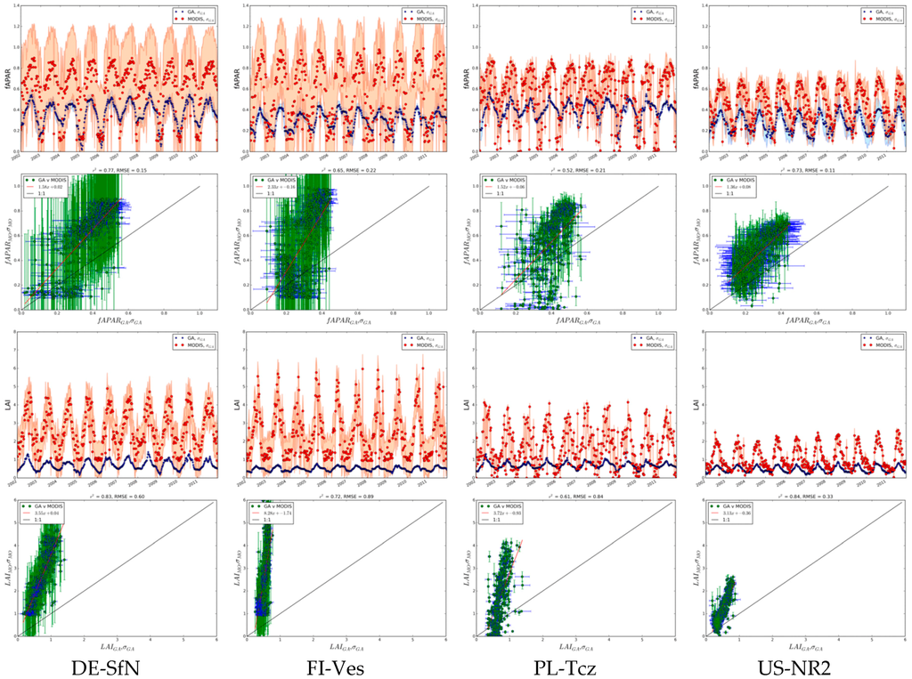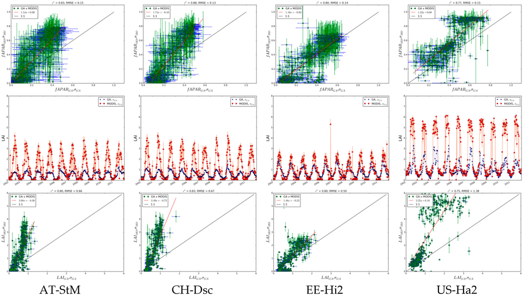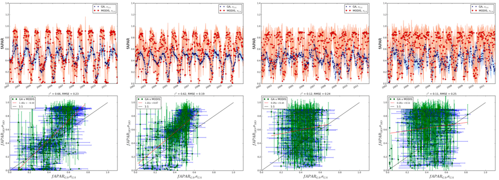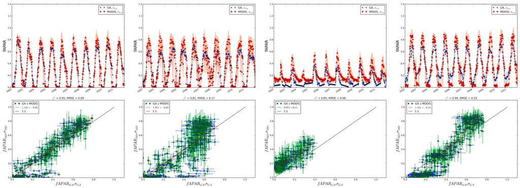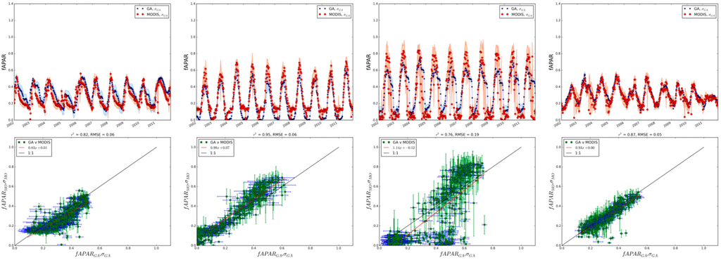 Locations and cover type descriptions for the FLUXNET site-level comparisons are given above in Section 2.1.6. For each of the selected cover types and for each site, fAPAR and LAI values derived from GlobAlbedo (denoted GA) and MODIS (denoted MO), are compared over the period 2002–2011. Scatter plots of the parameters are then presented, with r2 and RMSE of the linear fit in each case.
