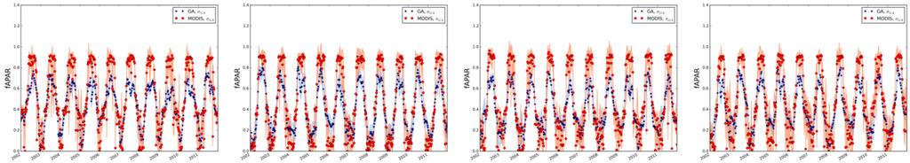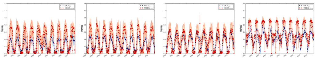 Therefore, as for LAI whilst the definitions of fAPAR are apparently clear and unambiguous, EO-derived values are subject to the assumptions of retrieval and observation characteristics. This is of course the case for all EO-derived biophysical properties, even those which appear to be near-direct measurements such as surface temperature, surface reflectance and albedo. Here, the GlobAlbedo-derived estimates of fAPAR arise from the retrieval of LAI i.e., they are the values arising from the RT model-derived LAI values such that observed fluxes can be reproduced by the RT scheme. In this sense, the GlobAlbedo-derived fAPAR values are not “effective” in the sense of the LAI values as described above—they arise as a function of the LAI retrieval process.
