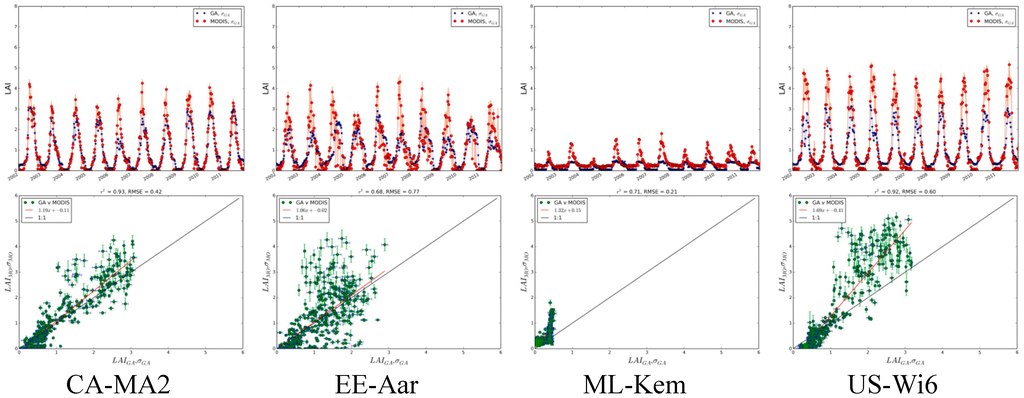 LAI values agree to within 10%–15% in peak season for CA-MA2 for example. Agreement on timing is also strong for CA-MA2 and US-Wi6, as demonstrated by r2 values > 0.9, but lower for EE-Aar and ML-Kem (r2 values 0.68 and 0.71 respectively). Slope in these sites lies between 1.06 and 1.32 (again, the ML-Kem site is the higher one) and intercepts are −0.41–0.15.