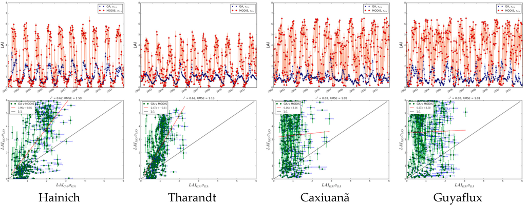 The LAI values are very different between GA and MO across all sites, but with almost no correlation in the tropical sites. This is reflected in r2 values close to 0. This would indicate that the derived values should be interpreted with care in terms of timing and magnitude (relative or otherwise) at sites of this sort.