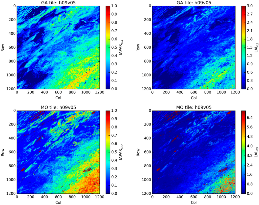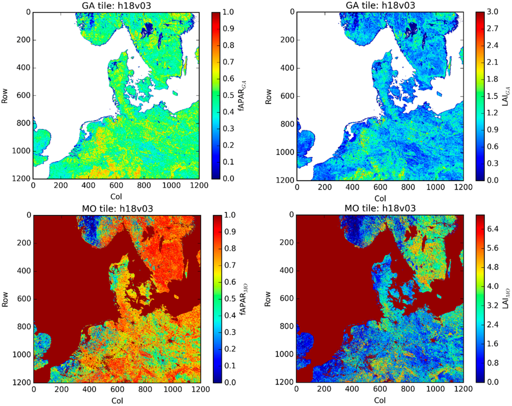 The MODIS LAI and fAPAR products are described in full in the Algorithm Theoretical Basis Document (ATBD) [8]. These data are perhaps the most widely-used global LAI and fAPAR products, in part due to being the only physically-based estimates of LAI and fAPAR derived using 3D RT model inversion [7,8]. The data used are the MODIS collection 6 products (released 2015) i.e., fAPAR and LAI derived from MODIS observations of surface reflectance, aggregated over 4 days (MCD15A2) from 1 km composites of observations, using data aggregated from MODIS sensors aboard both the Terra and Aqua platforms (collection 6 MCD15A2 product). MODIS data were obtained from [38]. Aggregation over time maximizes the chances of obtaining sufficient good quality (cloud free primarily) observations to allow model inversion, and assumes that the surface is stable over the aggregation period. 3D RT model inversion is via a look-up-table (LUT) containing pre-computed values of RT-modelled reflectance across a range of model parameter and observation configurations. The LUT is divided into 8 biome types, representing structurally different 3D vegetation canopy types. The resulting LAI and fAPAR values are provided at 1 km, with an associated uncertainty derived from the inversion scheme, and quality assurance (QA) flags indicating the quality of the inversion. Here we only consider values flagged as highest quality in the QA data. It is important to reiterate that when comparing between GlobAlbedo-derived and MODIS values we do not imply that either product is “right”; as described above, the products rely on different RT model (and processing) assumptions, and these are different from those used in field measurements using optical devices, which are in turn not the same as direct, destructive measurements (the only real answer).