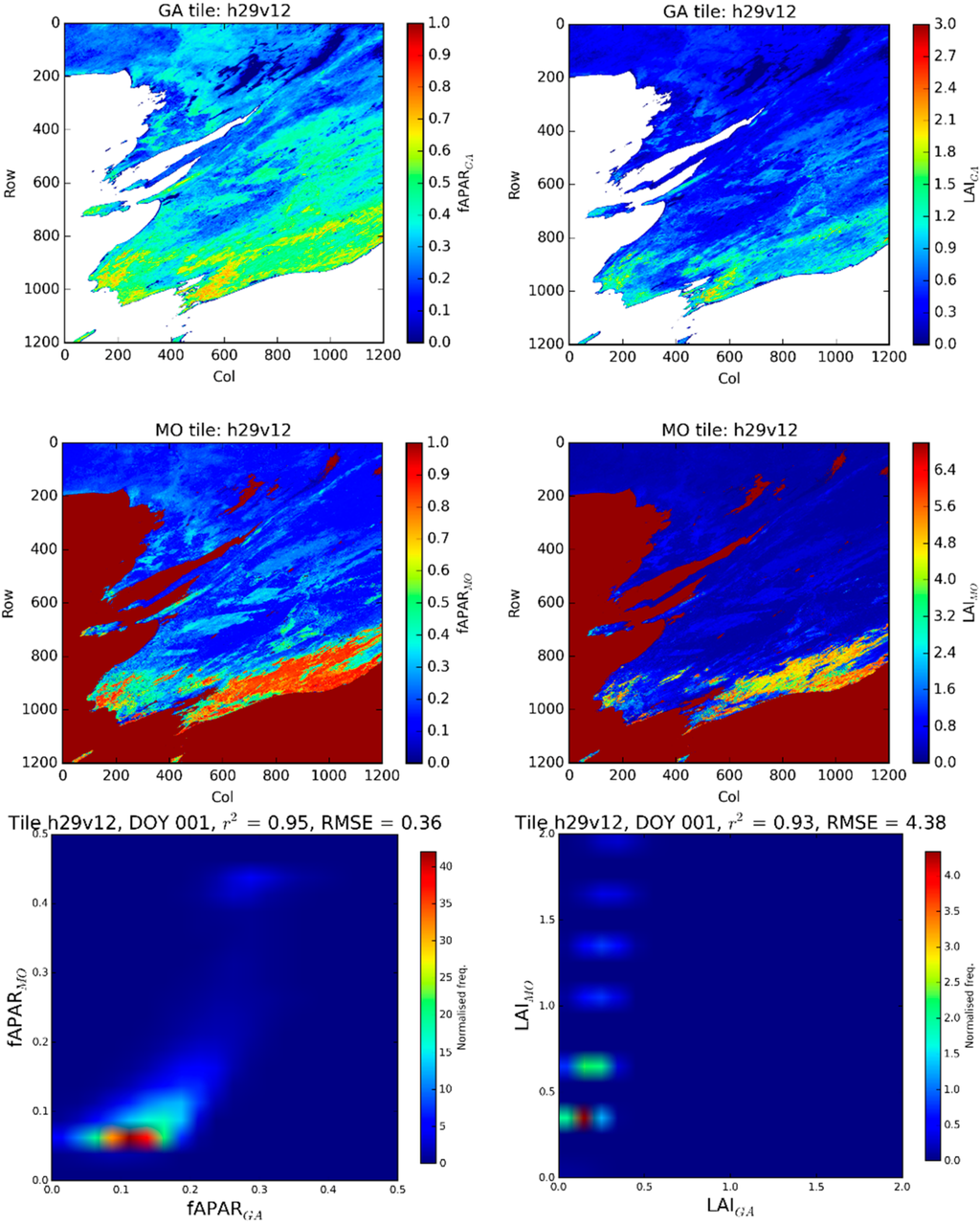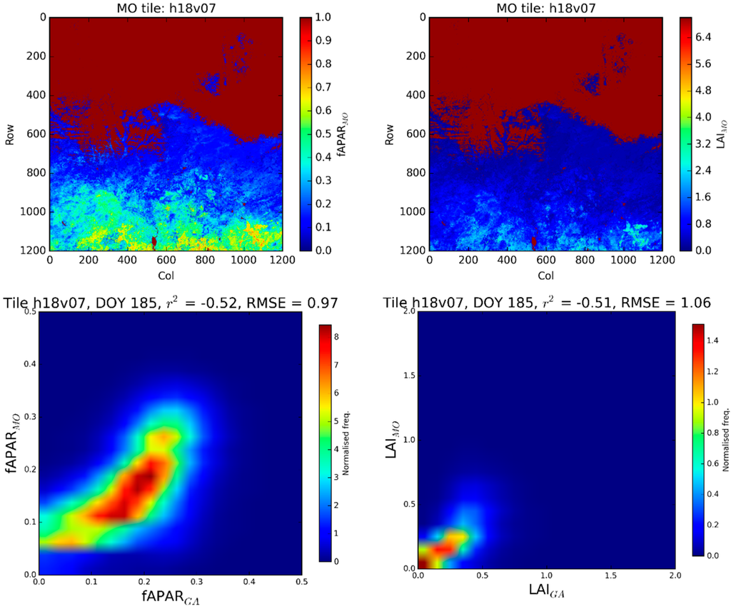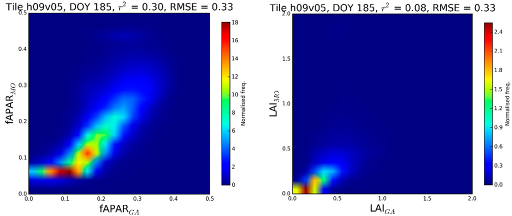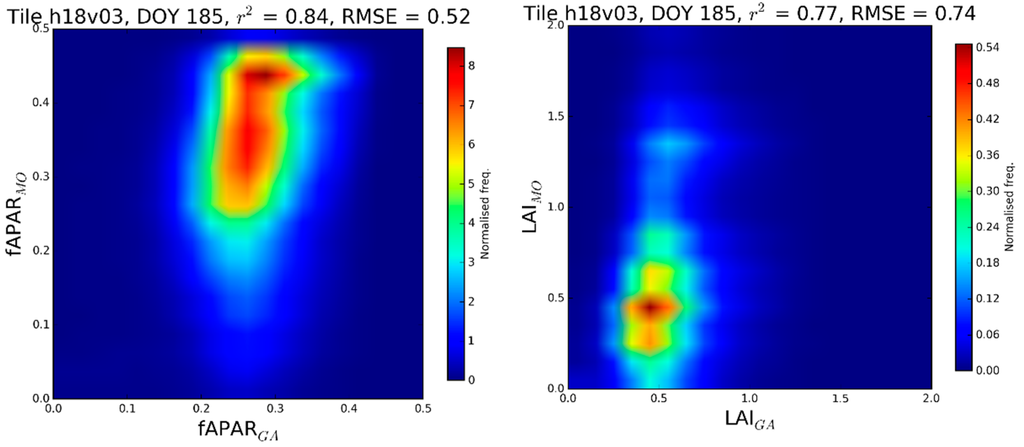 Tiles are compared from a given 8-day period in 2002 at mid-summer for each tile i.e. day of year (DOY) 185 for northern hemisphere tiles h09v05, h18v03, h18v07, and DOY 001 for southern hemisphere tile h29v12. In each case, scatter plots of the GlobAlbedo-derived and MODIS fAPAR and LAI values for all pixels in each tile, for all equivalent DOY values over the period 2002–2011 are also shown. These scatter plots are shown as 2D histograms (or “heatmaps”) i.e., the (x, y) location of each point represents the value of GlobAlbedo-derived and MODIS parameter in 20 bins along each axis respectively, and the color represents the frequency of samples in each bin. Comparisons are shown first for fAPAR and then LAI for each of the tiles. Agreement across tiles ought to be expected to be lower than for individual sites, due to the mixed nature of the cover types covered in a given tile. This is particularly true for very heterogeneous tiles where there is significant agriculture i.e., tile h18v03 for W. Europe. These comparisons are included to illustrate large-scale regional trends between the two datasets.