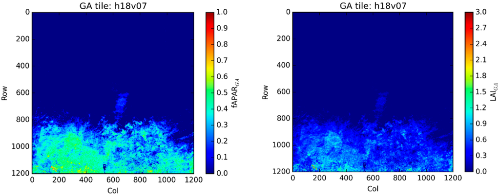In general, the different RT model schemes lead to consistently lower values of LAI and fAPAR in the GlobAlbedo-derived products compared with MODIS. This is clearly demonstrated in the values of the slope of the regressions summarized in Table 2, which are almost all >1 for fAPAR, except for one or two cases where the correlations are particularly poor anyway. For LAI, this difference is even more marked with slopes mostly between 1.5 and 3 but up to 8 in one or two cases. It is worth stressing again that a naïve comparison of one product against the other might lead to the conclusion that they are fundamentally incompatible, rather than estimates of the same properties made under different (but equally valid) assumptions. As a result, if values are to be used for surface energy balance, or driving global vegetation models, care must be taken to take this into account when using either product [49,50]. The per-tile comparisons shown in Figure 9, Figure 10, Figure 11 and Figure 12 show the same general behavior i.e., high correlations in areas of seasonal vegetation, less likely to be affected by cloud and/or snow, lower correlations elsewhere, and with consistently lower values of both GlobAlbedo-derived LAI and fAPAR (and much lower range).
