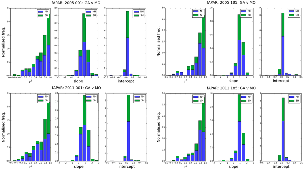 Figure 13 demonstrates correlation between the fAPAR products is almost exclusively positive with r2 values exceeding 0.8 for: 37% of NH tiles and 52% of SH tiles on 2005 DOY 001 (NH winter, SH summer). This fraction rises in 2005 for DOY 185 to 48% and 63% of the NH and SH tiles respectively. For 2011, the distribution of r2 values is almost identical. The slope and intercept of the correlation between the two products obviously represent the translation from one to the other. If the two datasets are to be compared or used in conjunction with each other, then these values could be used for transforming from one to the other. From Figure 13 the gradient between the fAPAR products lies between 0.5 and 1.5 for ~70% of all tiles on DOY 001, and 80% of all tiles on DOY 185 for both 2005 and 2011. Lastly, the intercept of the linear regression of the fAPAR products lies within −0.1 and 0.1 for 90%–95% of all tiles in both 2005 and 2011, with a slightly greater spread of values for winter cases than summer.