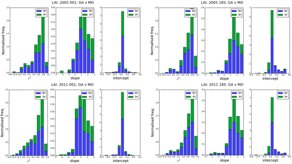 Finally, the LAI regression intercept lies within −0.1 and 0.1 for ~80% of cases for all NH and SH tiles in 2005 DOY 001. For 2005 DOY 185 this percentage drops to 62% of NH tiles but remains high at 86% for the SH tiles. For 2011, the behavior is very similar—high values for all SH cases, but falling between NH winter and summer.