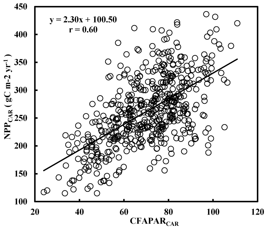 At the same time, the derived CFAPAR was averaged into FAPAR at the CAR level (FAPARCAR) based on the area of the cropland mask of the CAR. The correlation analysis between NPPCAR and FAPARCAR was then conducted to evaluate the representativeness of CFAPAR for cropland productivity.
