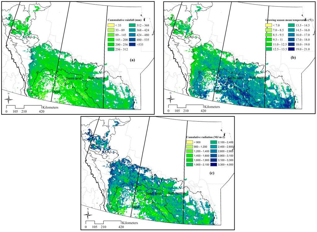 The spatial distributions of climate indices, including cumulative rainfall, daily mean temperature and cumulative daily radiation during a growing season, are shown in Figure 4. In general, their spatial distribution patterns are consistent with the distribution of agro-climatic zones. The growing season cumulative rainfall in the prairie region was generally less than 450 mm (Figure 4a), and decreases from the sub-humid area to the arid area. The sub-humid area received the highest amount of rainfall in each growing season (~273 mm), especially in the area along the western and eastern borders of the region (>350 mm). The cumulative rainfall was higher in the semi-arid area (~205 mm) than in the arid zone (~183 mm). The growing season mean temperature generally decreased from the sub-humid to the arid region (Figure 4b). The pattern of temperature distribution in the sub-humid region was more complex than in the other two regions as the temperature in AB was lower than that in SK and MB. The cumulative radiation during a growing season showed an opposite order of distribution compared with that of daily average temperature (Figure 4c). The highest value of radiation occurred in the western portion of the sub-humid region in the province of AB.