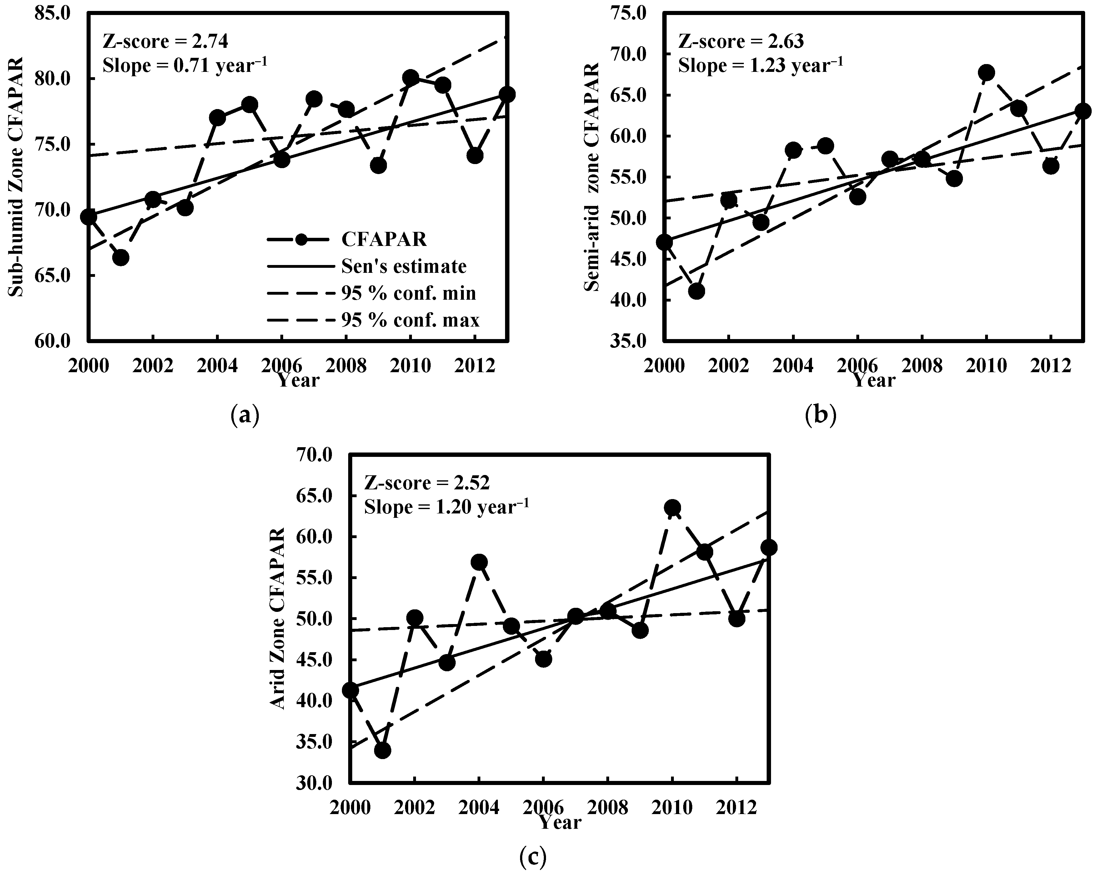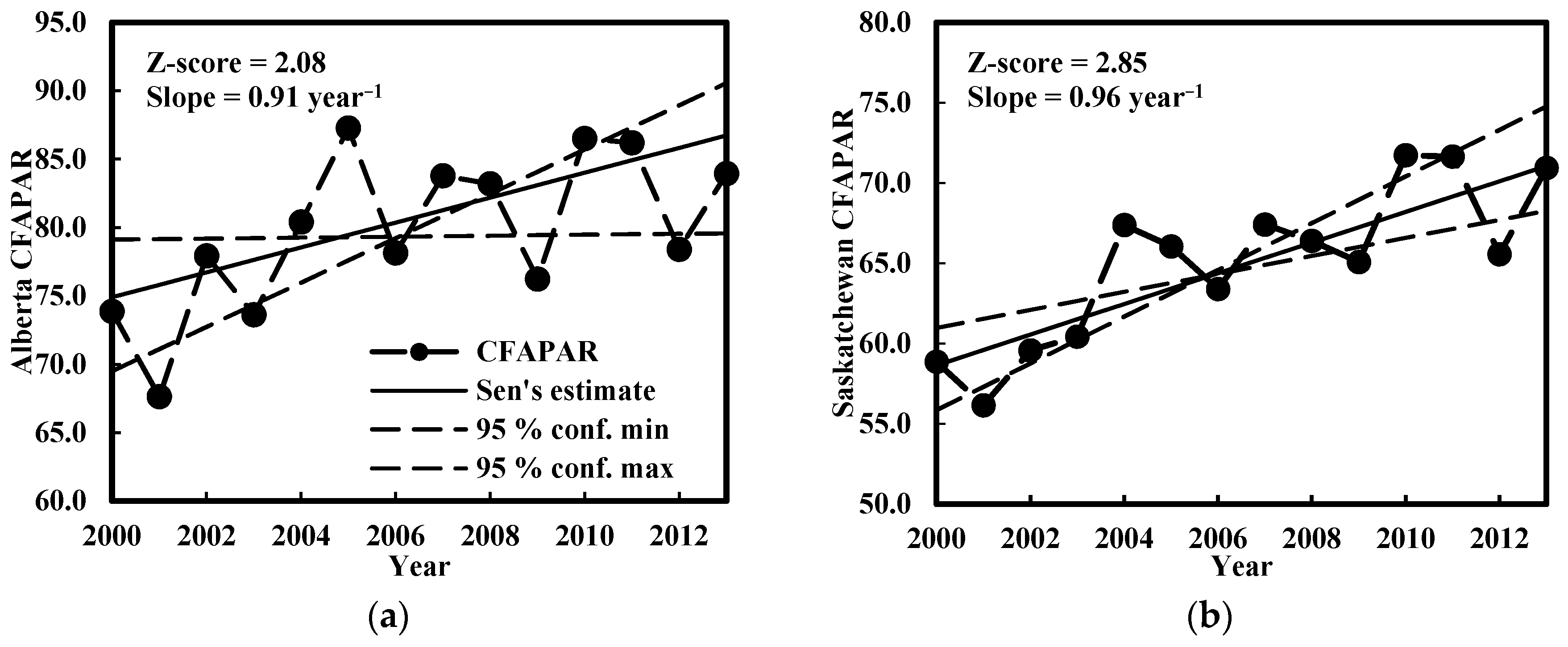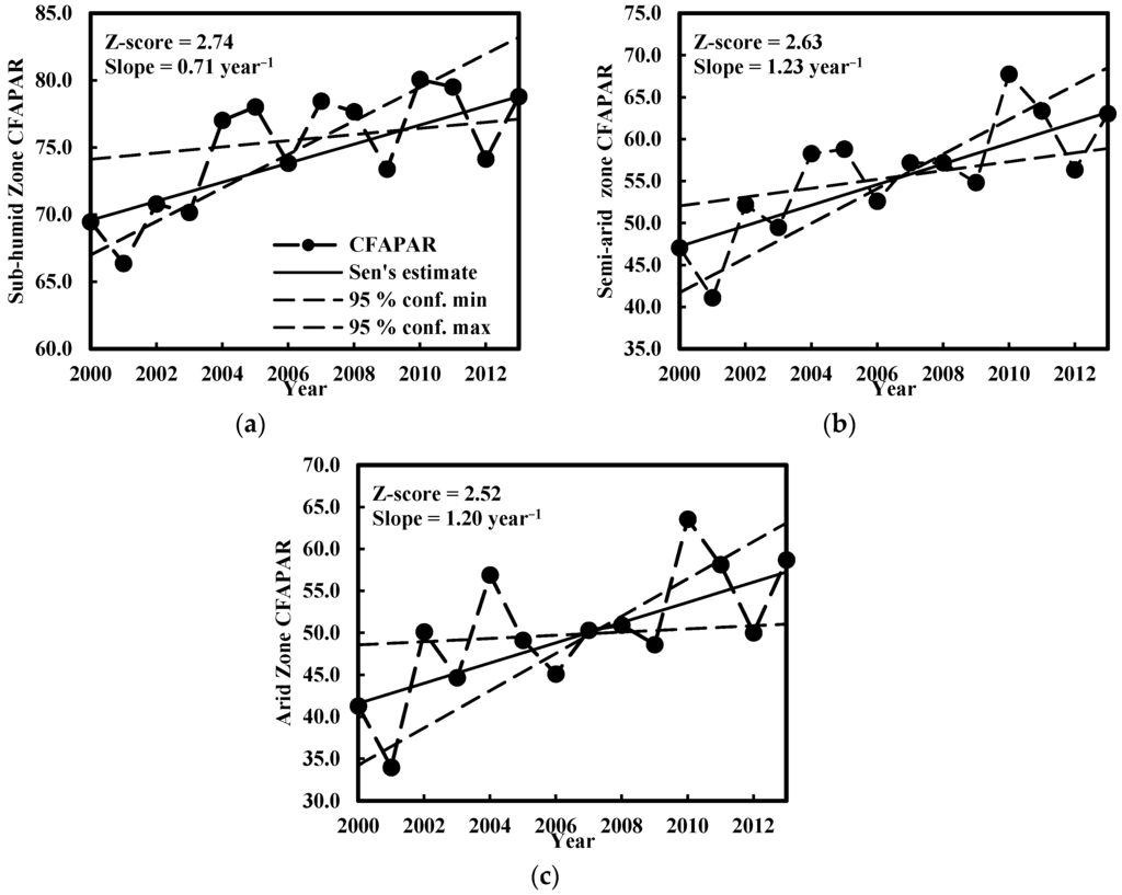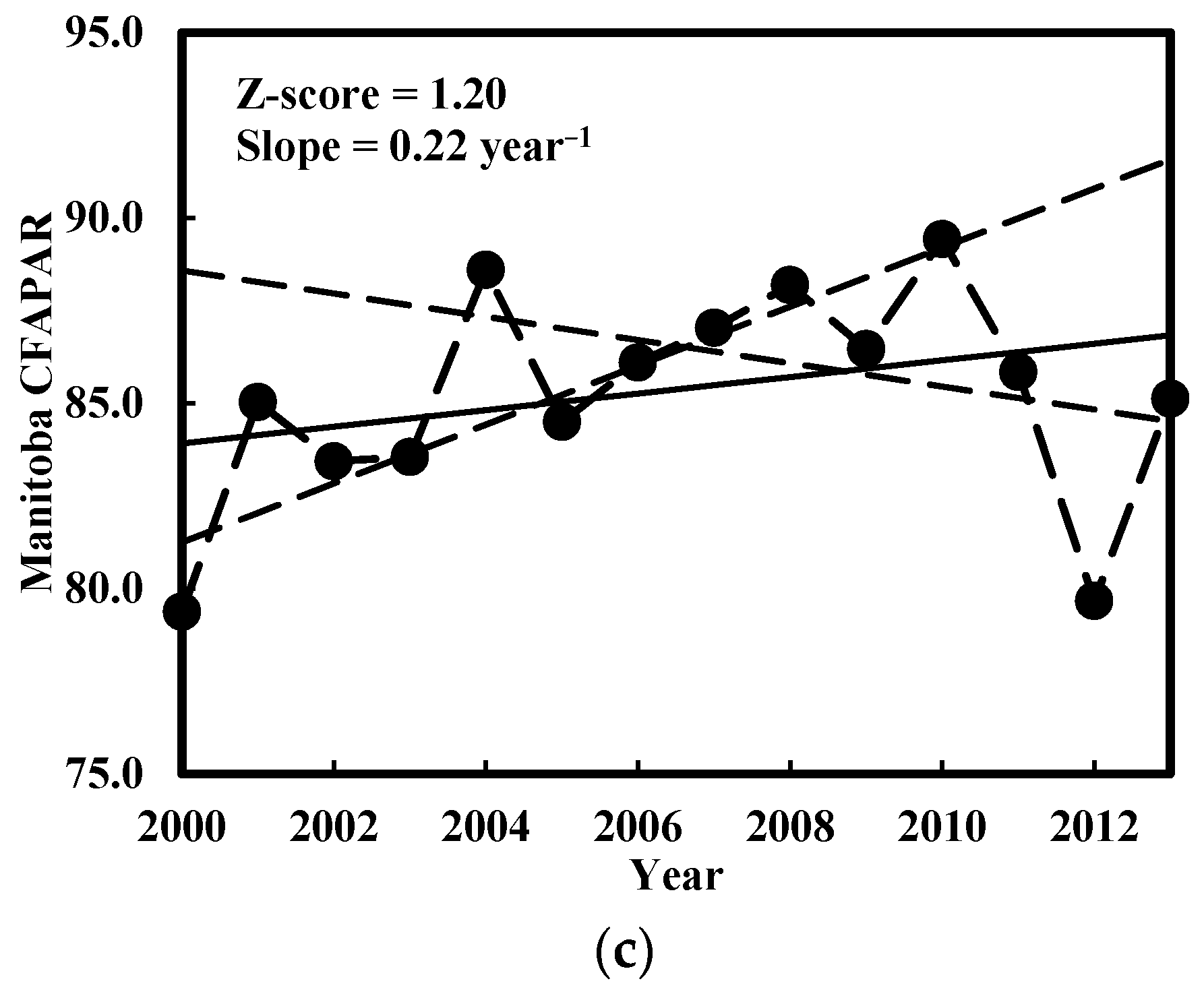 Figure 8. Temporal trends of annual CFPAR in three agro-climatic zones in the Canadian Prairies, sub-humid zone (a); semi-arid zone (b); and arid zone (c); respectively.