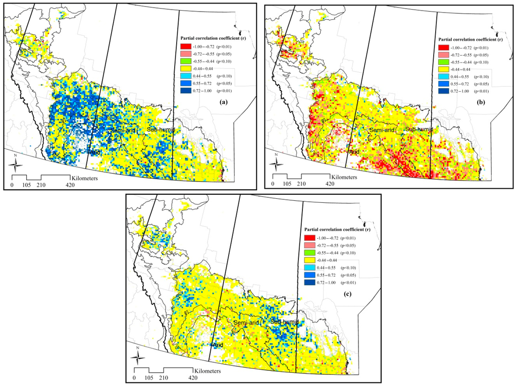 For cumulative rainfall in a growing season (Figure 9a), the variability of cropland productivity is generally sensitive to rainfall variability with a positive relationship in more than 70% of the study areas (Figure 9a). The partial correlation coefficient (r) over most cropland areas in the Canadian Prairies was higher than 0.55, especially in AB and SK. Cropland productivity in most areas was negatively affected by growing season mean temperature (Figure 9b); however, except for areas in the arid zone located mainly in southern SK and southeast AB, the effect was not significant. For the cumulative radiation during the growing season (Figure 9c), there was no significant correlation between cropland productivity and radiation at the 0.05 level in most areas, indicating that cropland productivity in these areas was not normally limited by radiation. However, cropland productivity in some localized croplands of central AB and northeast SK was sensitive to radiation with a positive partial correlation coefficient greater than 0.55 (p < 0.01, n = 14). For AB and SK, it could be observed that rainfall played the most important role in variation of cropland productivity with a positive relationship, followed by temperature variability and radiation variability (Figure 9). The variation of cropland productivity in MB was more affected by the temperature variability (p < 0.10) and the limiting factors were more complicated than that in AB and SK. In summary, the analysis in this section demonstrated that cropland productivity variability in most areas of the Canadian Prairies was mainly driven by the amount of rainfall.