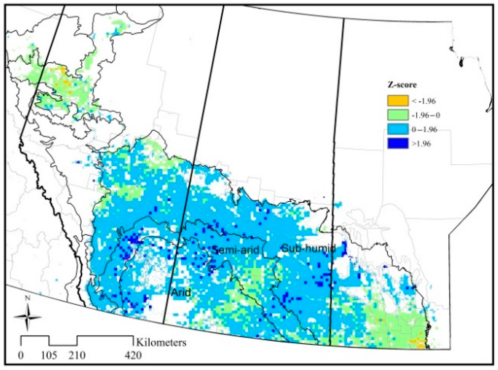 To further determine the trend of cumulative rainfall during observed years, the analysis was conducted using the M-K test and the results are shown in Figure 10. Areas with a positive z-score, indicating an increasing trend, were distributed in most areas of the Canadian Prairie region. However, the increasing trend was not significant at the level of 0.05 (|Z-score| ≤1.96) except in some localized areas.