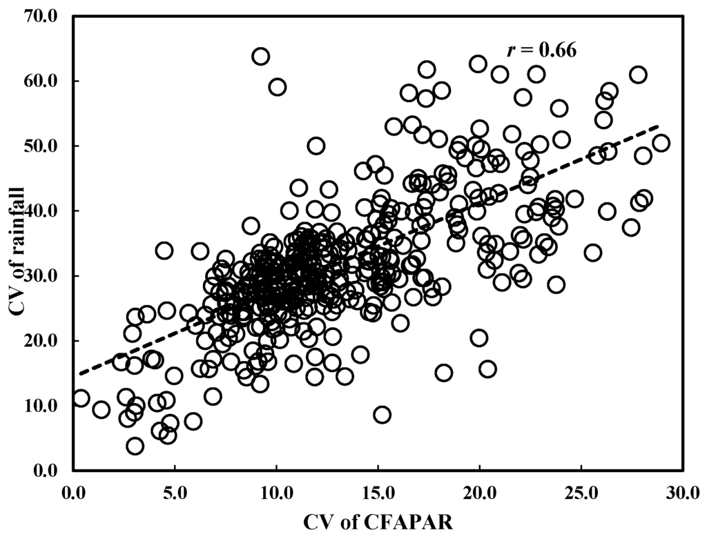 Figure 13. Linear relationship between the coefficient of variation (CV) of CFAPAR and that of rainfall. Samples located inside cropland mask were randomly selected using the Create Random Points tool of ArcGIS software.