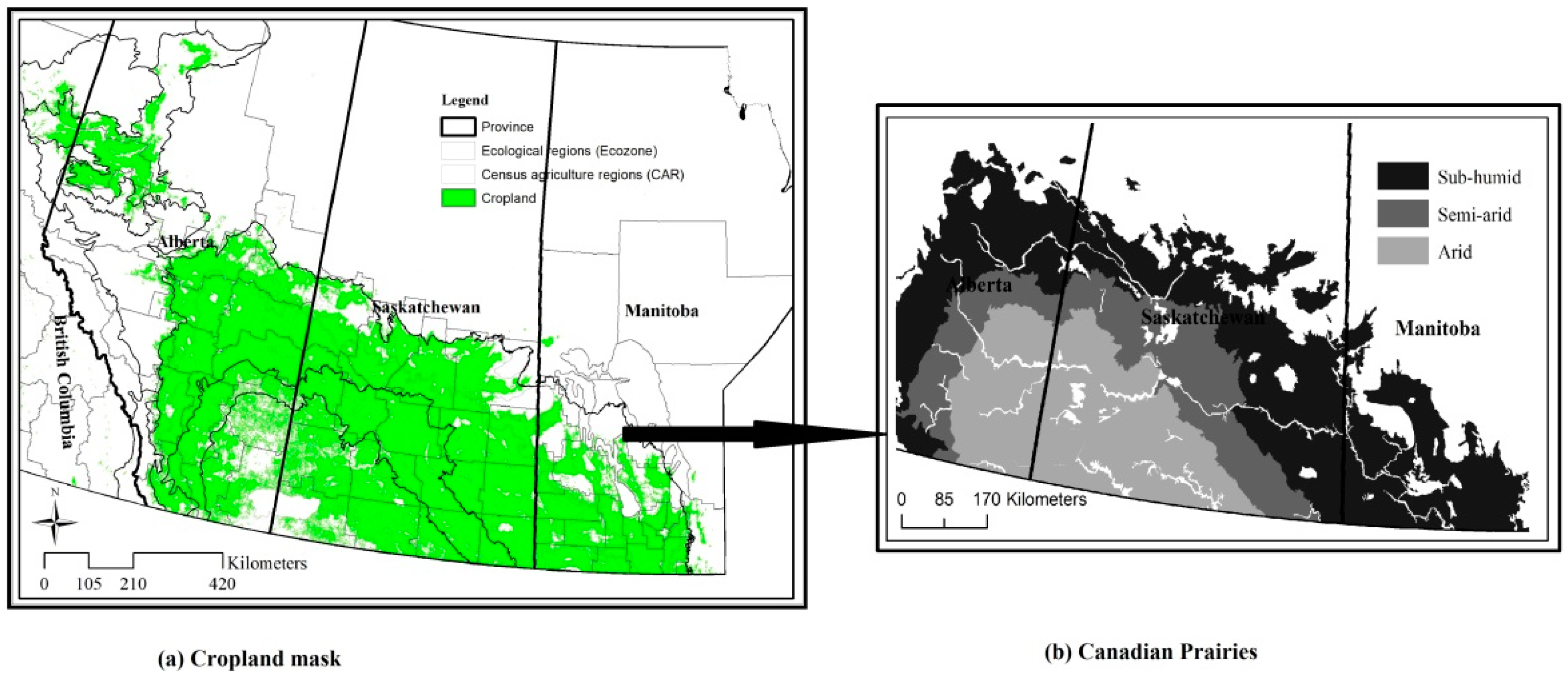 Figure 1. The general cropland mask extracted from the MODIS land cover product (MCD12Q1) (a) and agro-climatic zones (b) on the Canadian Prairies.