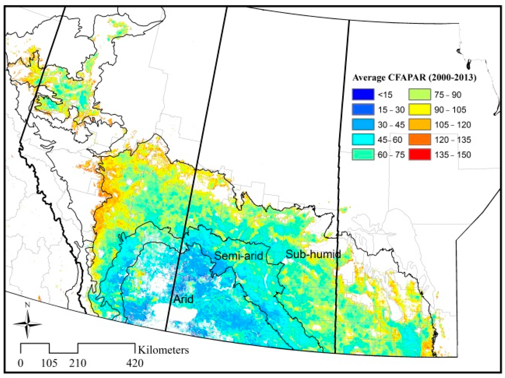 The authors would like to thank NASA for providing the MODIS FAPAR product (MOD15A2), land cover product (MCD12Q1) and the Modern Era Retrospective-analysis for Research and Application (MERRA) dataset. Dr. Dan McKenney of Natural Resources Canada provided the gridded climate dataset (http://cfs.nrcan.gc.ca/projects/3/1). This work was funded by Agriculture and Agri-Food Canada (Project #1130) and the Canadian Space Agency (Project #GRIP2013GENSX).