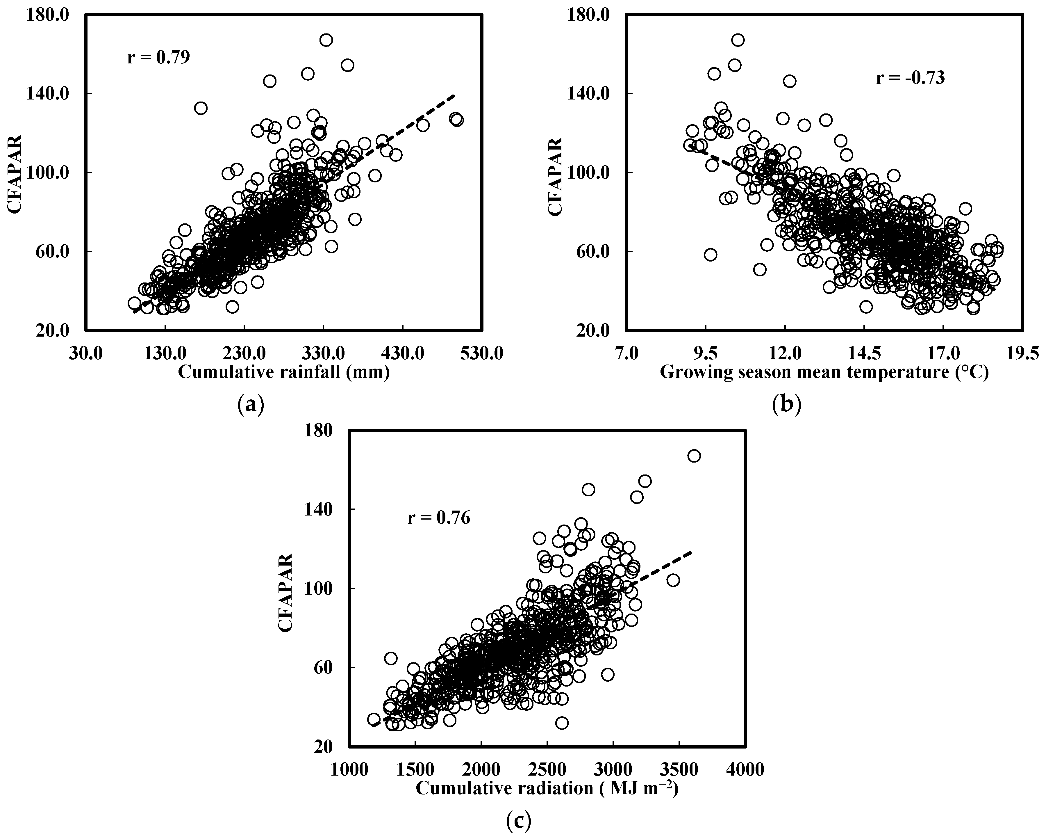 By comparing the spatial patterns of cropland productivity in Figure 3 and climate indices in Figure 4, we observed that the spatial patterns of the climate variables over the growing season were very similar to that of cropland productivity. One of the factors that contributed to these spatial patterns was the duration of the growing season length, which was determined by SOS and EOS, as discussed by Meroni et al. [4]. The overall correlation between average annual CFAPAR and climate variables are shown in Figure 5. Both cumulative rainfall (r = 0.79, p < 0.01) and cumulative radiation (r = 0.76, p < 0.01) were positively correlated to cropland productivity, while the growing season mean temperature showed a negative relationship (r = −0.73, p < 0.01) with cropland productivity. Partial correlation analysis (Table 1) demonstrated that spatial patterns of the annual CFAPAR was mostly affected by the cumulative rainfall (r = 0.60, p < 0.01) and the growing season mean temperature (r = −0.46, p < 0.05), and not by cumulative radiation (r = 0.00, p > 0.1).