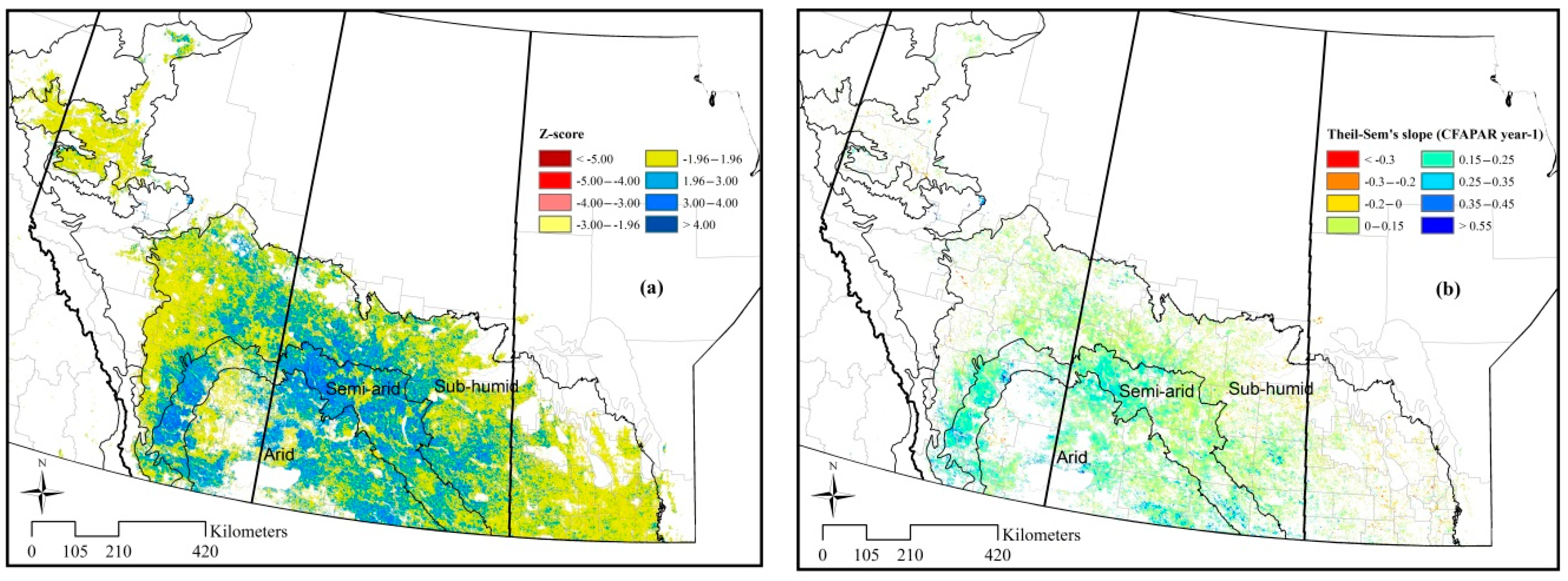 To examine the spatial-temporal variation of cropland productivity, we conducted the trend analysis using the M-K test at the pixel level. Figure 6a shows the trend of CFAPAR from 2000 through 2013 represented by the M-K z-score. Results show that the z-score in most crop areas is above zero (Figure 6a), indicating a general increasing trend of cropland productivity from 2000 to 2013. The z-score in some areas such as the southern and central regions of SK and AB was higher than in other cropland areas. Some small areas such as the area in the northern part of MB and northwestern part of AB, show a decreasing trend (z-score < 0). At the significance level of 0.05 (|z-score| ≥ 1.96), a significant increasing trend of cropland productivity was observed in AB and SK, as seen from the Theil-Sen median slope (>0.10) in Figure 6b. A significant decreasing trend of cropland productivity at the 0.05 level was observed in small areas scattered throughout MB (TS slope < −0.05).