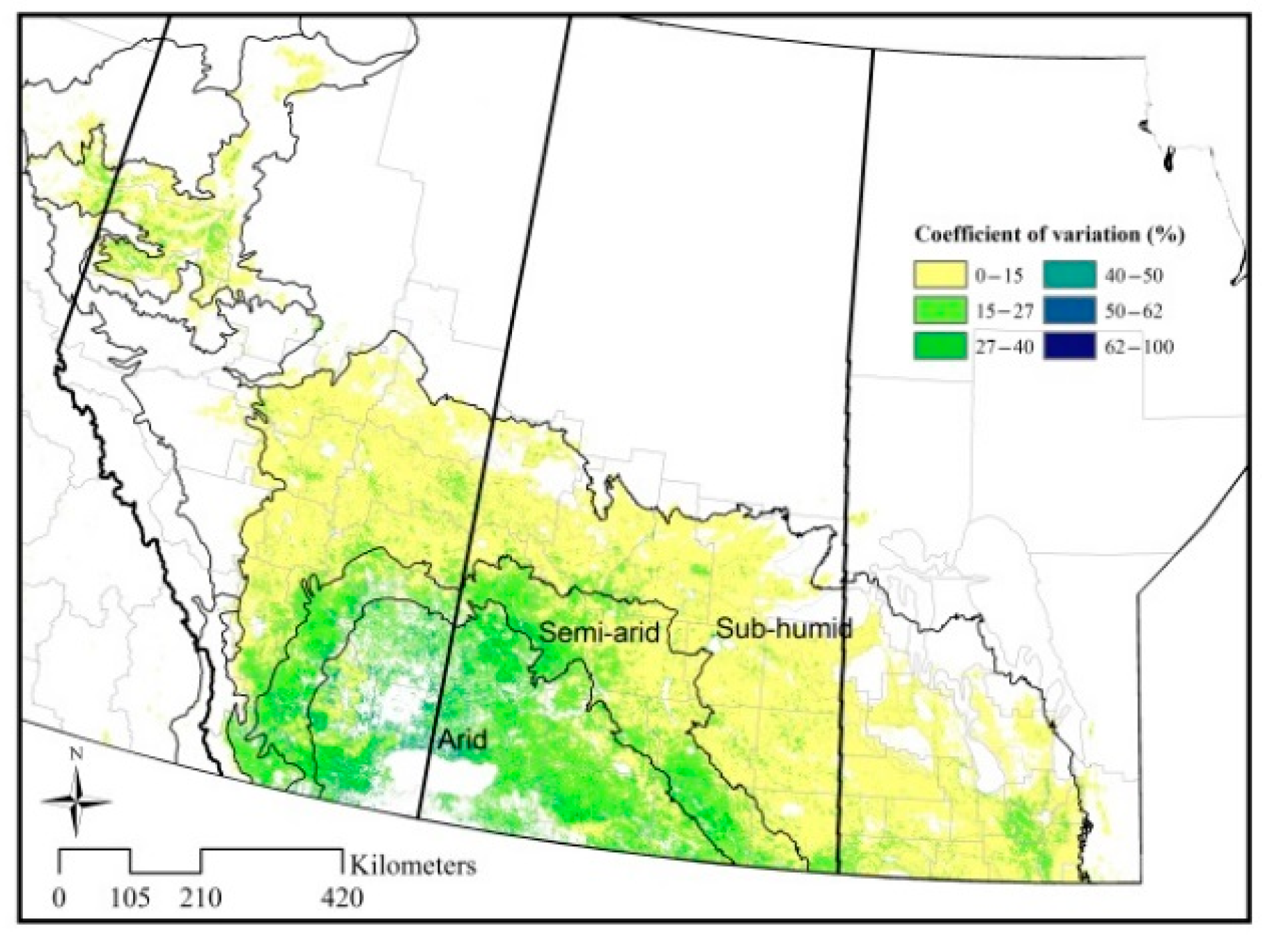 Canada is one of the largest food producers and exporters in the global market (www.grainscanada.gc.ca). In addition to cultivar turnover and changes in agronomic management, variations of crop growth and productivity are mainly driven by climate variability [1,2,3,4]. Studies indicate that the climate is changing in Canada [5,6,7,8,9], and that it has a profound impact on crop production in the agriculture regions [2,3,5,10,11], especially in the Canadian Prairies that account for around 85% of Canada’s cropland area (http://www.statcan.gc.ca/). A better understanding of the impact of climate variables on cropland productivity can help improve crop management practices and the accuracy of crop production prediction, which is urgently needed with the increasing worldwide demand for food [12,13].