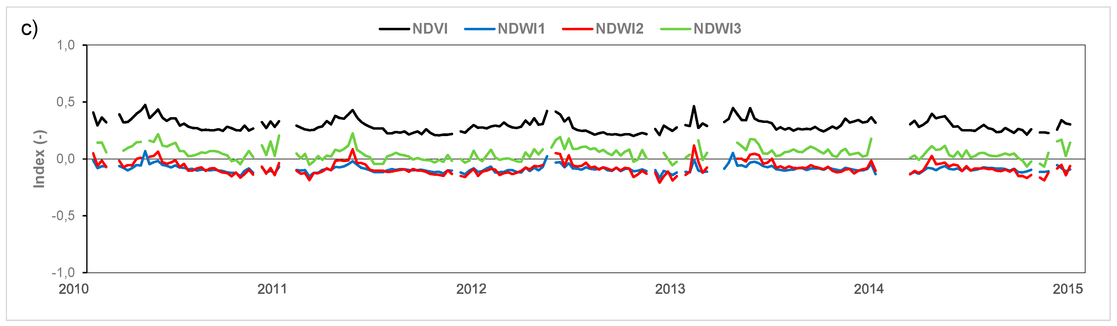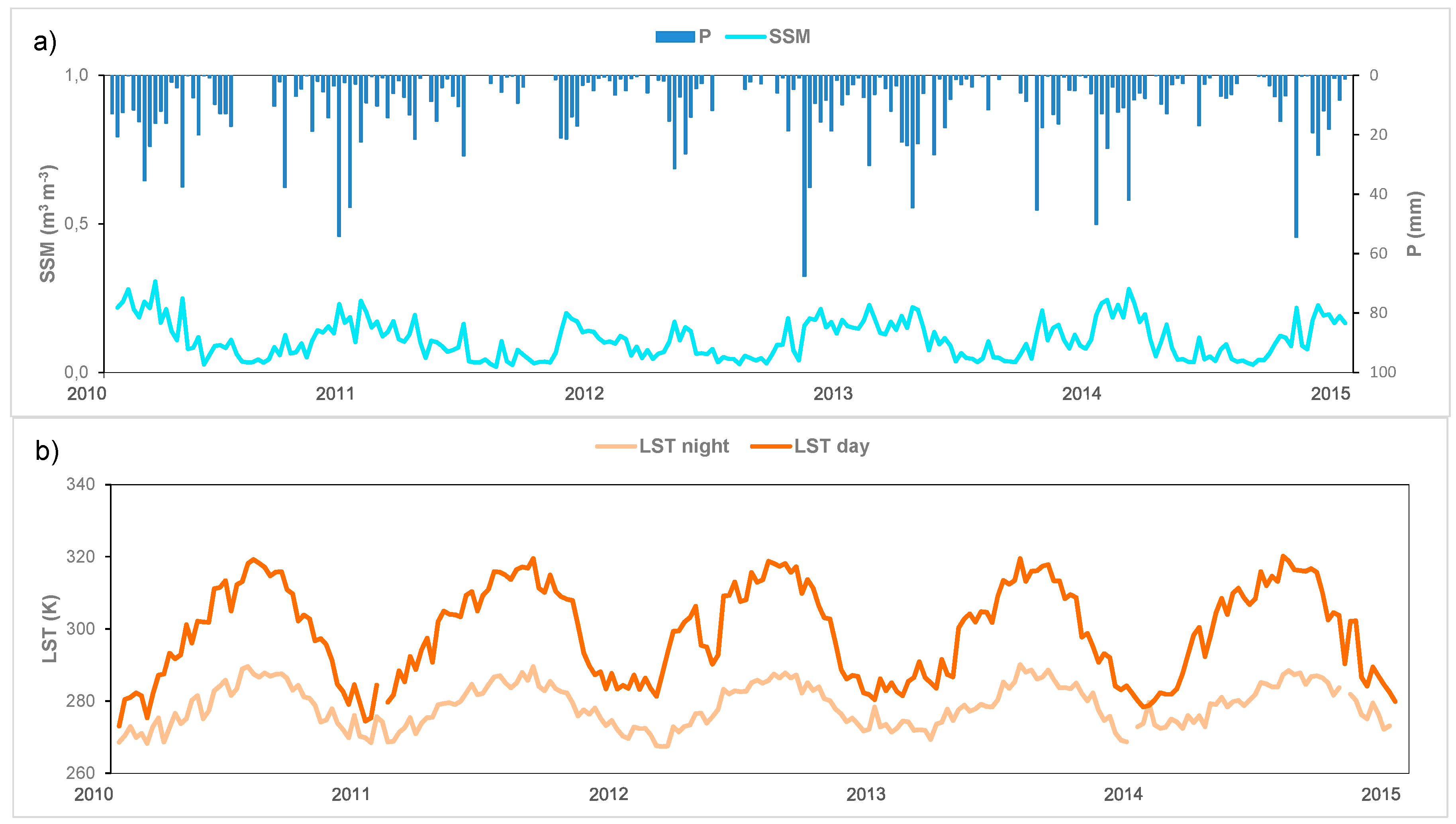 Temporal cycle of the input parameters: (a) SSM; (b) LST; (c) NDVI and NDWI for the REMEDHUS average during the study period (years 2010 to 2015).