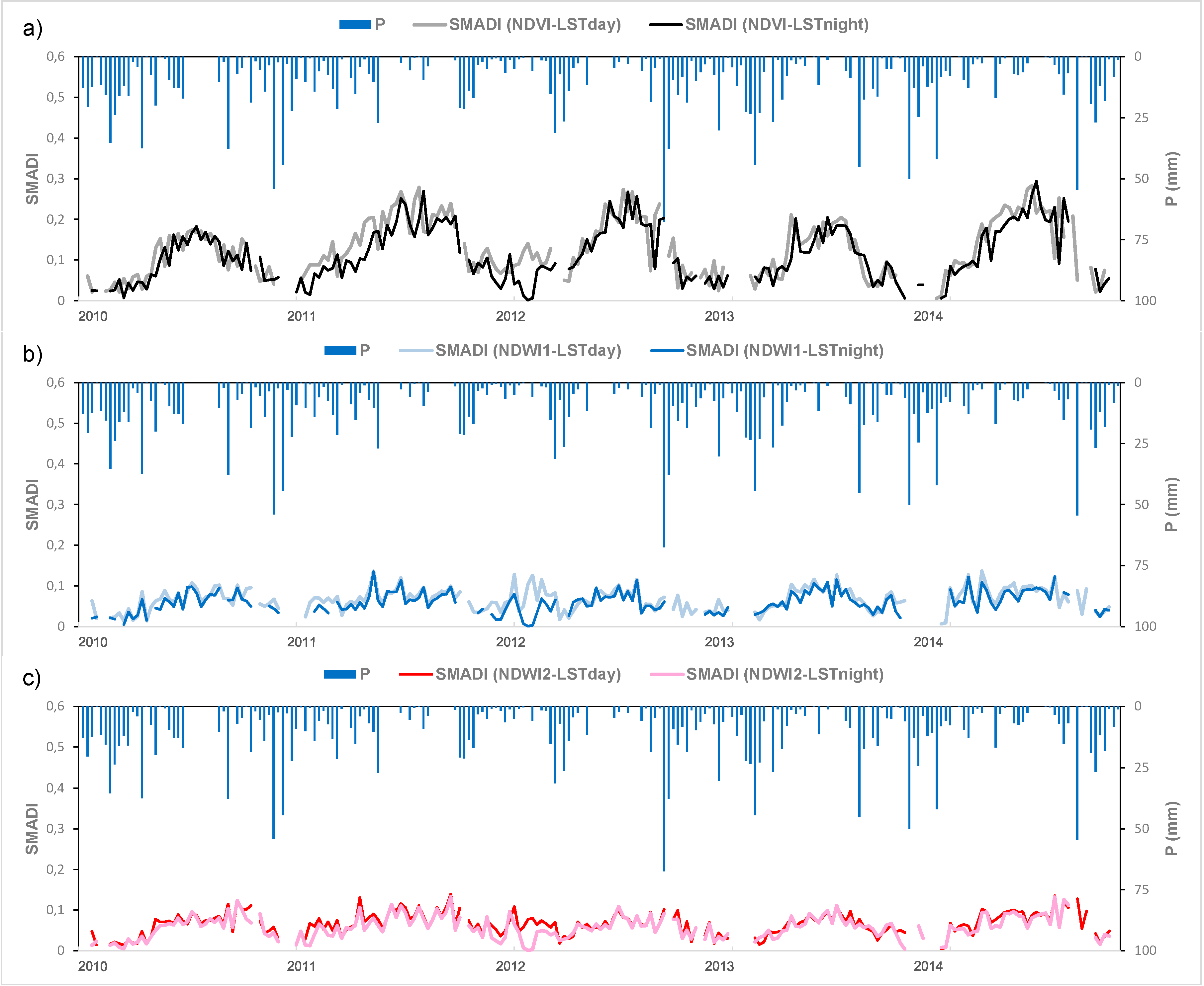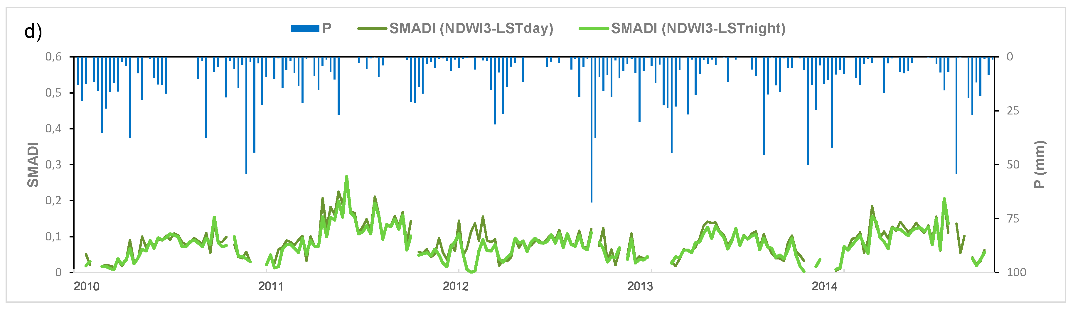 Eight SMADI versions were calculated from the two alternatives of LST (day/night) and the four indices NDVI, NDWI1, NDW2 and NDWI3 (Figure 3). The NDVI-derived SMADI shows the highest dynamic range (0–0.3) and NDWI1 and NDW2 the lowest (0–0.1). Also, the four NDWI-derived SMADI resulted in a noisier or more instable curve than the NDVI one. All the SMADI versions showed a marked seasonality (Figure 3a–d), but the low values of NDWI 1 and 2 (Figure 2c) lead to unrealistic values of SMADI (Figure 3b,c). Comparing the annual cycles, only NDVI and NDWI3 allow discriminating year 2010 as the wettest year. Gu et al. [64] investigated the use of NDWI and NDVI for drought assessment over the U.S. Great Plains and found that NDWI was slightly more sensitive than NDVI to the initial onset and to the peak severity of drought conditions over grasslands. In the current research the vegetation variable is included as a descriptor of the vegetation status and vigor, but not as a proxy of drought itself. This could explain why the use of NDVI in the drought index was more effective than the use of the NDWI alternatives.