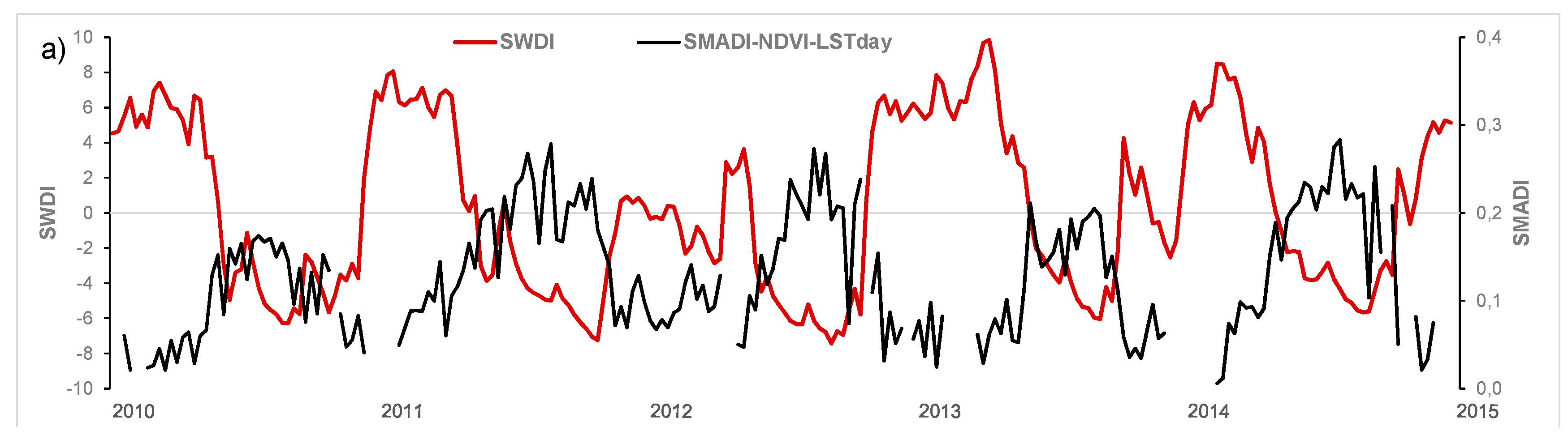 Figure 4a,b show the time evolution and scatter plot of SWDI vs. the SMADI-NDVI-LST day (the case of highest correlations). Both indices show a marked seasonality and reveal the period from winter, 2011 to spring, 2012 as the driest of the series.