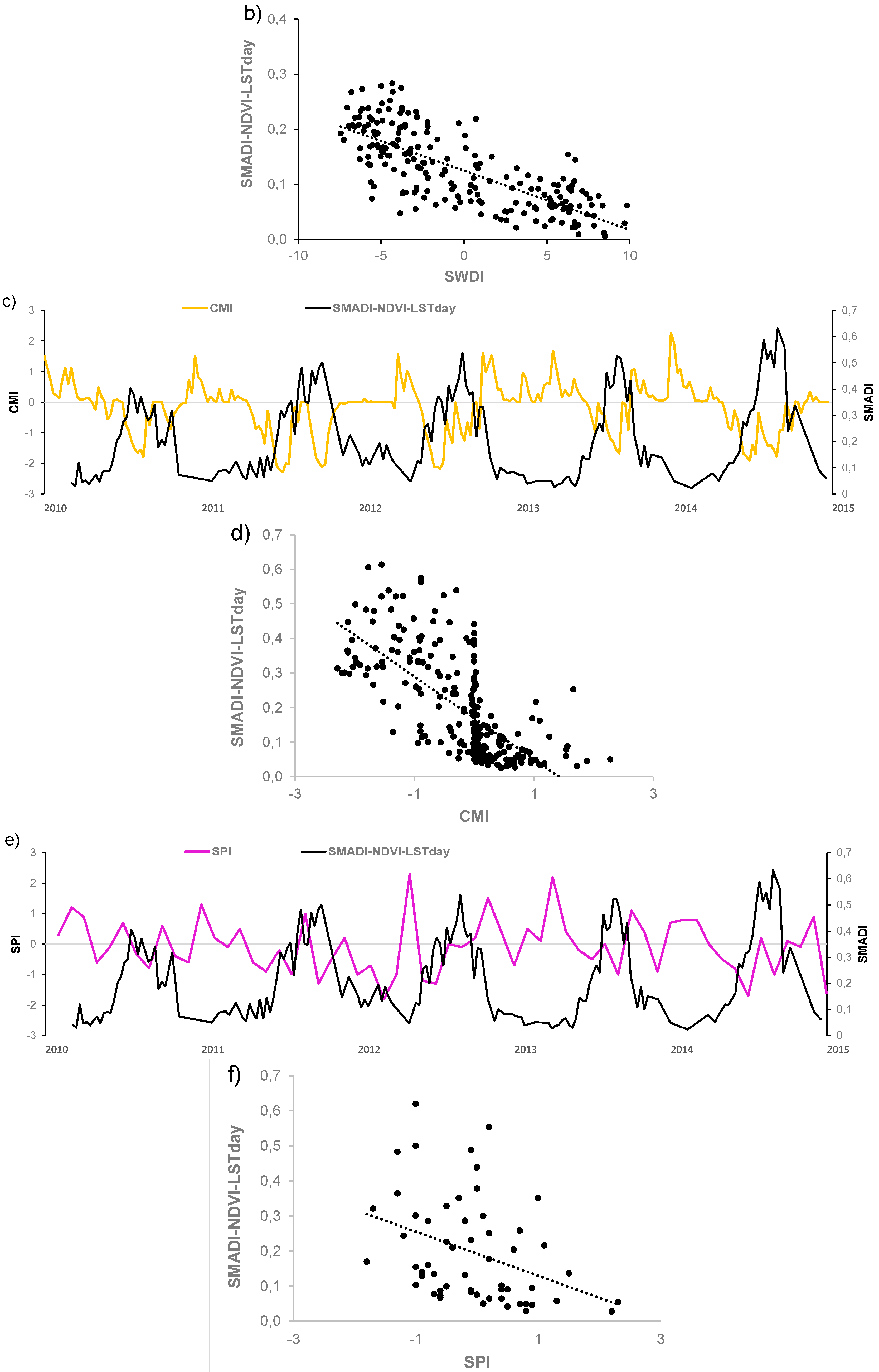 (a–f) Comparative evolution between SMADI (NDVI and LST day version) and the SWDI at the REMEDHUS area average (a); the CMI at the Matacán station (c) and the SPI at the Matacán station (e). Scatter plot of series correspond to (b,d,f), respectively.