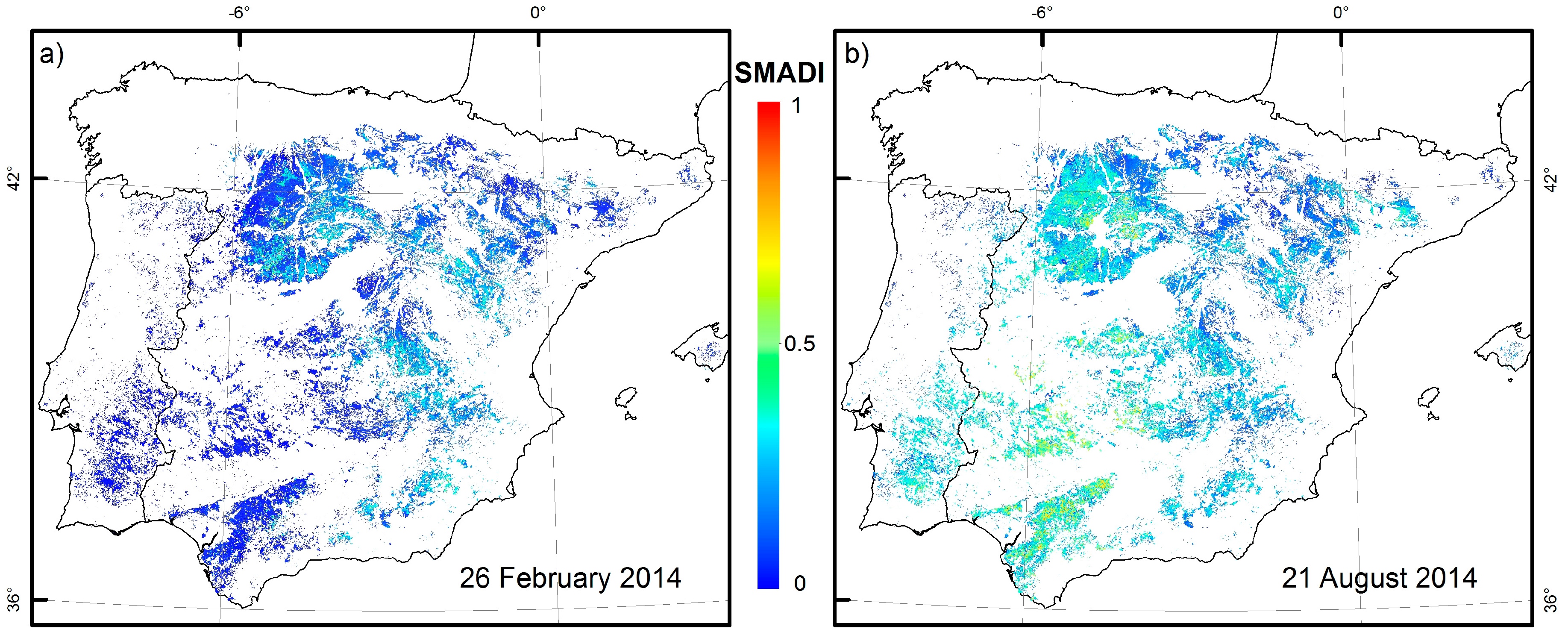 (a) SMADI maps (NDVI-LSTday version) for DoY = 57 (wet period) and (b) DoY = 233 (dry period).