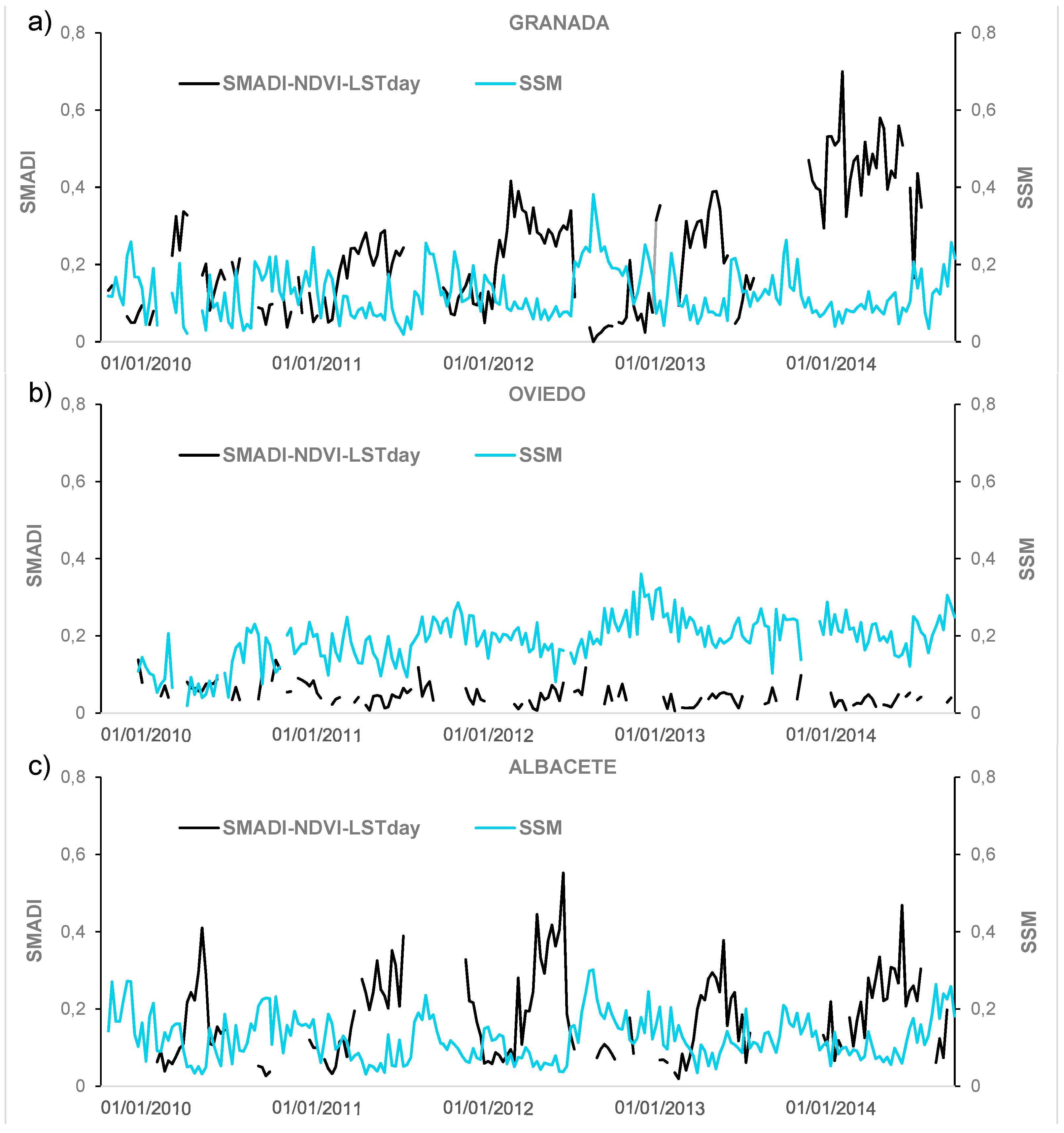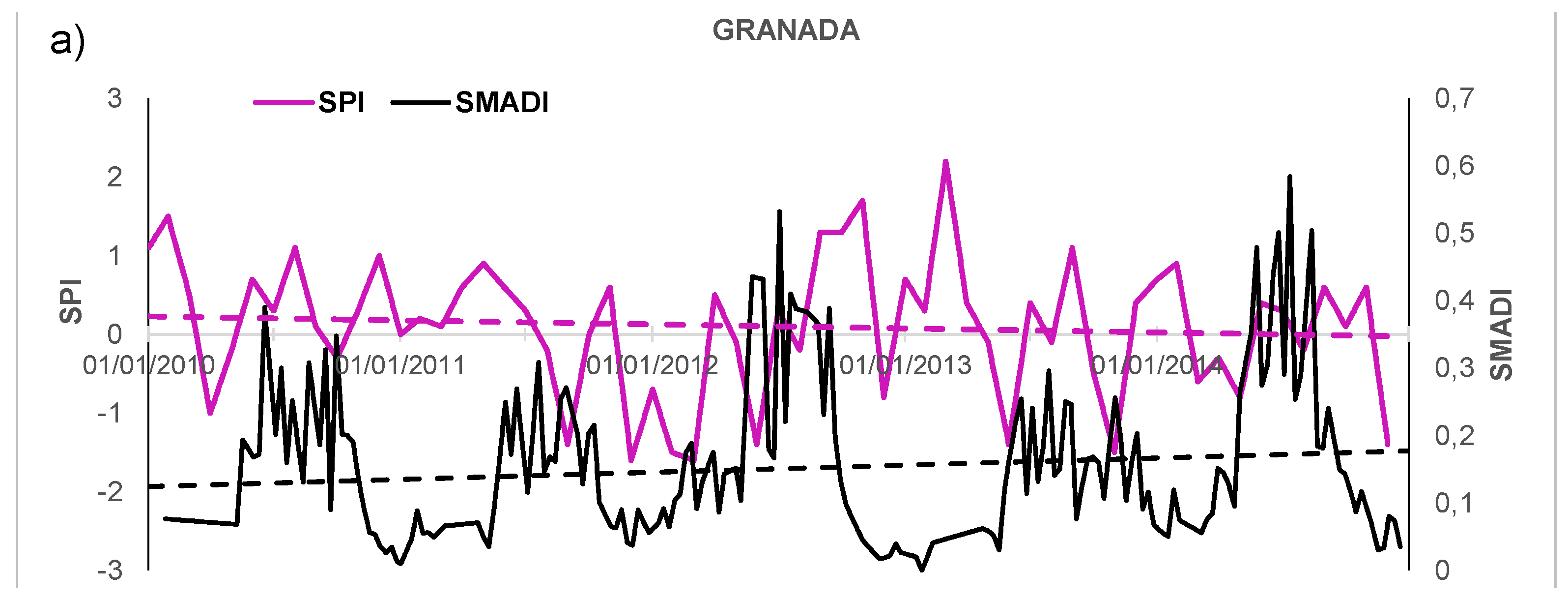 Finally, the comparison of SMADI vs. SPI in the Granada station (Figure 9c) showed an increase of the drought events length compared to the REMEDHUS area (Figure 9a,b), coinciding with the higher aridity of the Southeastern areas of the IP. Moreover, this increase can be especially distinguished in 2012 and 2014, the years where the harshest droughts occurred. Unlike SMADI, SPI showed drought values in winter and out of the growing season. However, the comparative analysis with SPI suffers from some caveats. First, it is a purely climatic indicator of drought, and the atmospheric processes are not always coupled with the soil-vegetation system, which is the basis of SMADI. Second, its monthly rate differs from the rest of indices making the comparison difficult, because a single value representative of an entire month should be assigned to a given date. Thus, the bad results of the time series correlation in Section 3.2 are not surprising.