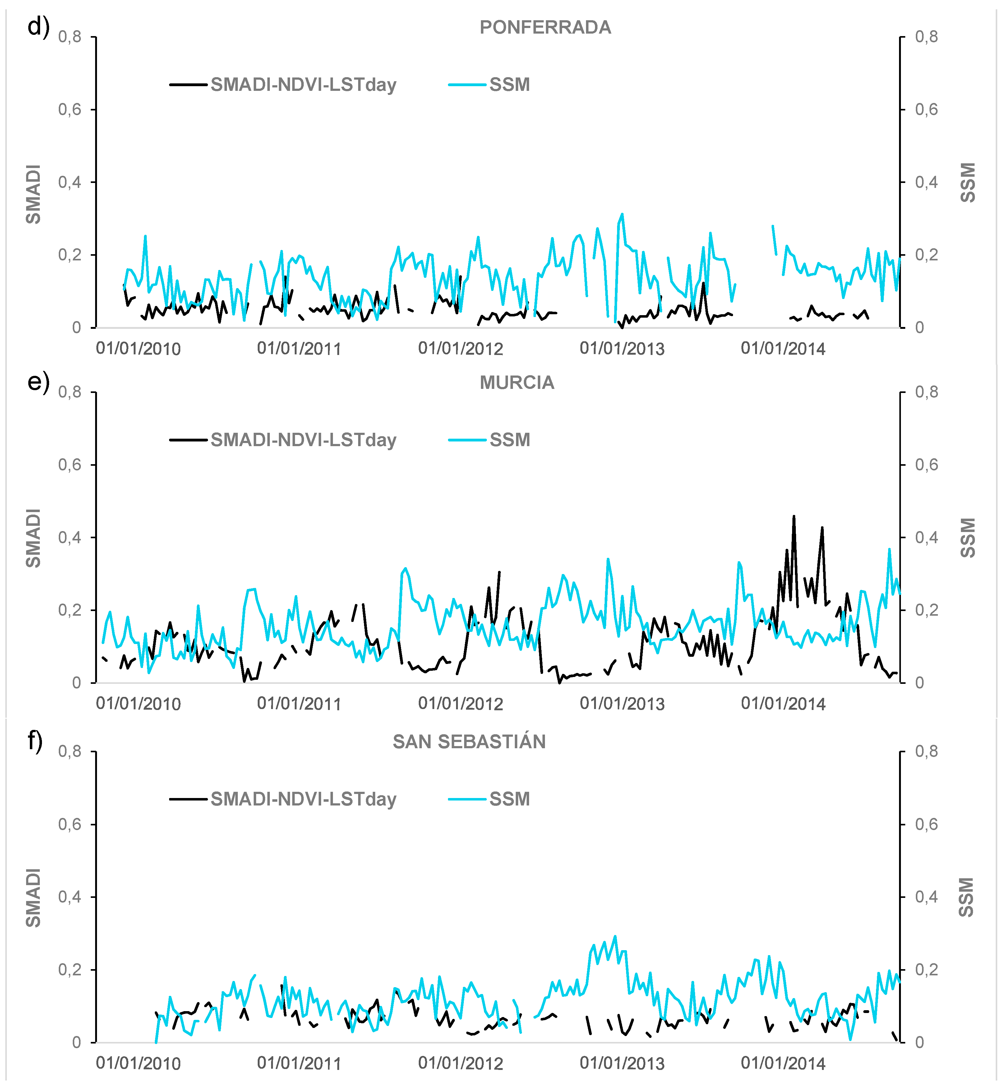 Eight SMADI maps of the IP for each day and version resulted from the calculations (Figure 5, only NDVI-LSTday version is shown for brevity). To qualitatively verify the behavior of SMADI and its input parameters under other climatic conditions than that of the REMEDHUS area, three dry areas and three wet areas were selected in the Northwestern and Southeastern parts of the IP, respectively (Figure 1). The good performance of the SSM and LST shown in the previous section (Table 2) was tested under other bioclimatic conditions, with the aim to analyze whether the synergistic nature of SMADI reacts better to the extreme conditions than the parameters related to soil or vegetation taken individually. Thus, SMADI and SSM curves were extracted in areas belonging to the dry (Figure 6a,c,e) and wet (Figure 6b,d,f) domains. The comparison between the SSM in dry/wet areas suggested that since there were not notable differences between the SSM for dry/wet areas, SMADI was much higher for the dry areas, indicating drought conditions, especially in 2012 and 2014. These results are evidence that SMADI exhibits a higher potential to determine synoptic drought conditions than SSM information alone.