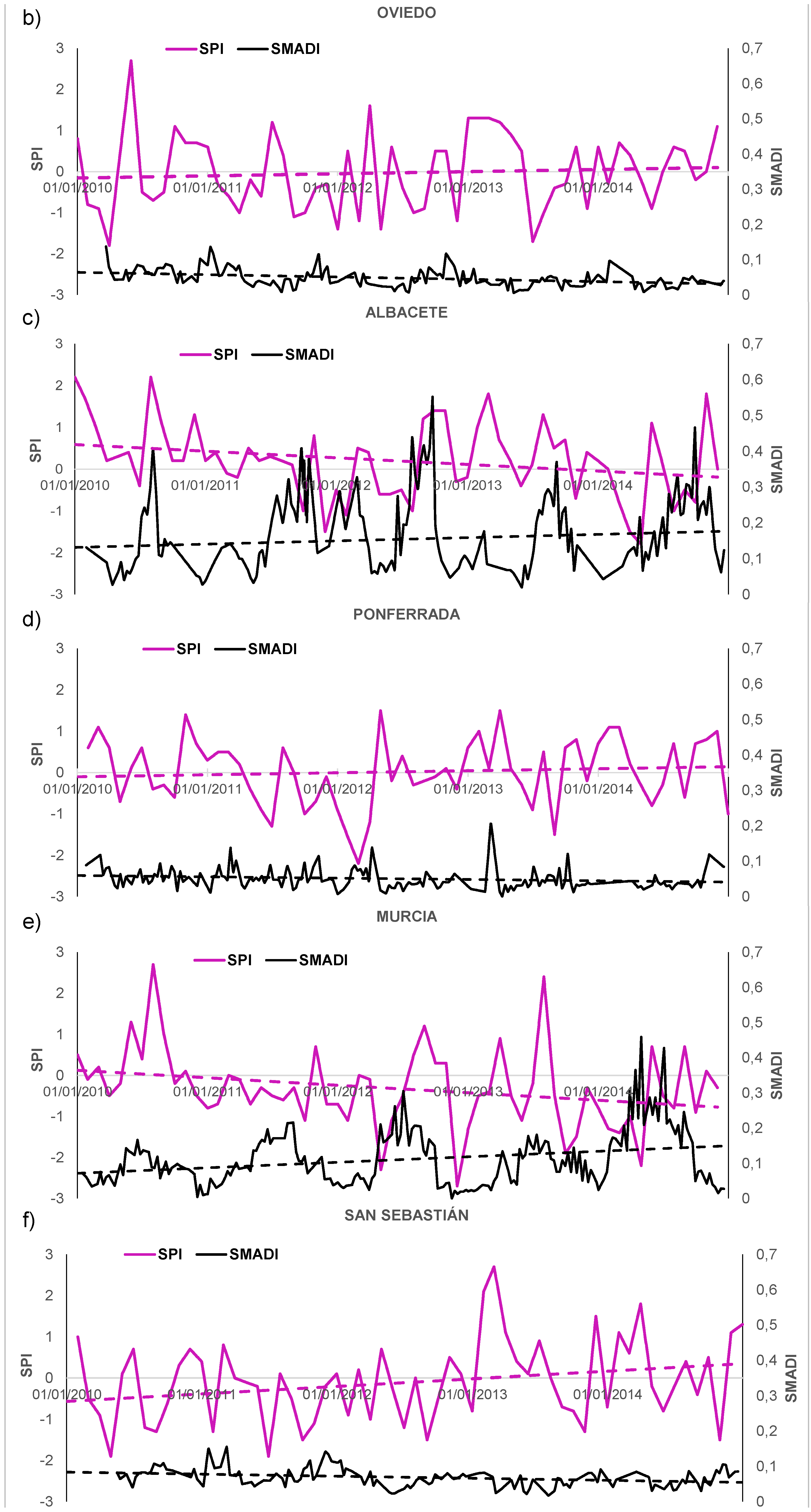 A distinctive temporal trend resulted from the analysis of SPI and SMADI temporal evolution over the selected dry/wet areas (Figure 8). A clear increasing SMADI trend along the period 2010–2014 was found (Figure 8a,c,d), in close correspondence with a decreasing SPI trend (both indices have an opposite sense), the latter in a lesser extent. This trend was also found in half of the stations located in the dry domain. This pattern was not found in the input parameters of SMADI (Figure 7), thus it should not be attributed to a similar trend for the input parameters. On the contrary, all the stations under wet conditions in the IP showed no trend (Figure 8b,d,f), meaning no increase nor decrease of the drought conditions described trough SMADI along time. However, since only a few stations under the wet domain had concurrent SPI/SMADI data (Figure 1), these trends must be further analyzed with a longer data set and additional systematic criteria.