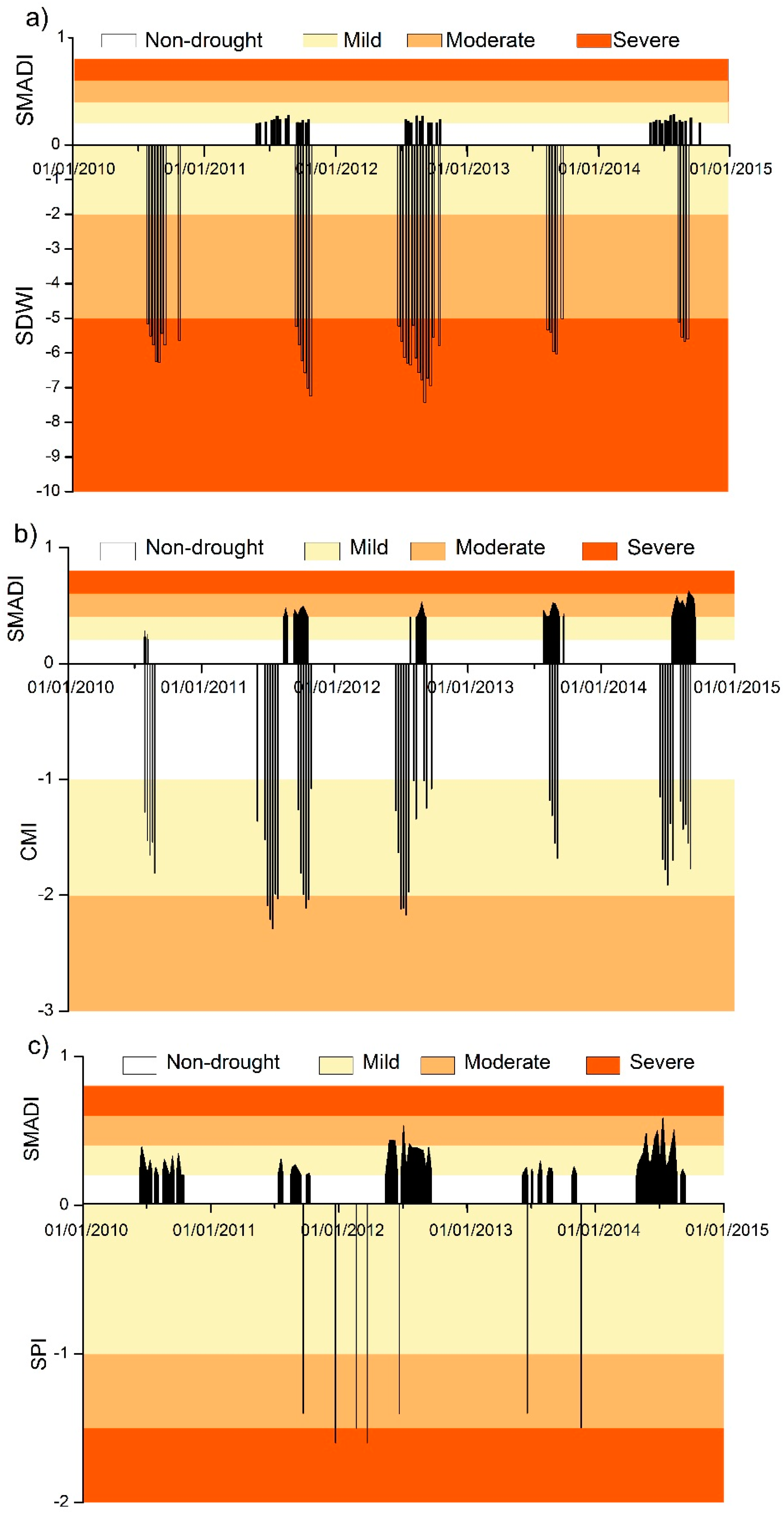 With these categories in mind, the duration and intensity of drought obtained with SMADI was compared to those resulting from SWDI and CMI at the REMEDHUS area and at the IP areas where SPI was available. Figure 9 shows a bar diagram representing drought events along the cycle (following thresholds and categories in Table 4) after SMADI (in top) and the other reference indices (SWDI at REMEDHUS, CMI at Matacán, and SPI at Granada) in the bottom, and a color scale depicting the intensity of drought. Overall, it can be noticed that the index that led to the most severe drought at the REMEDHUS stations is SWDI. The rest of indices barely reached moderate drought values at the Matacán station (CMI and SMADI) and few events of moderate drought in the Granada station, also a semiarid area, with the monthly SPI and SMADI. SWDI at REMEDHUS (Figure 9a) showed a remarkable seasonal pattern, leading to drought events in every summer from 2010 to 2014. In this case, SMADI seemed to be more conservative, since only years 2011, 2012 and 2014 showed periods considered as mild drought/abnormal dry. However, the duration of these dry spells are longer than those from SWDI in 2011 and 2014, and included the critical periods of the growing season (late May to July). It must be pointed out that those periods and intensities coincided with the outlook described in Section 2.3 from the AEMet and the EDO for this area. It should be mentioned that SMADI in REMEDHUS showed smaller impact of drought and fewer periods than Matacán (Figure 9b), even though they belong to the same area. A reason that could explain this lesser impact is that SMADI in REMEDHUS corresponds to a spatial average of the same six stations used for the SWDI study [12], whereas CMI was calculated at point scale on a single station.