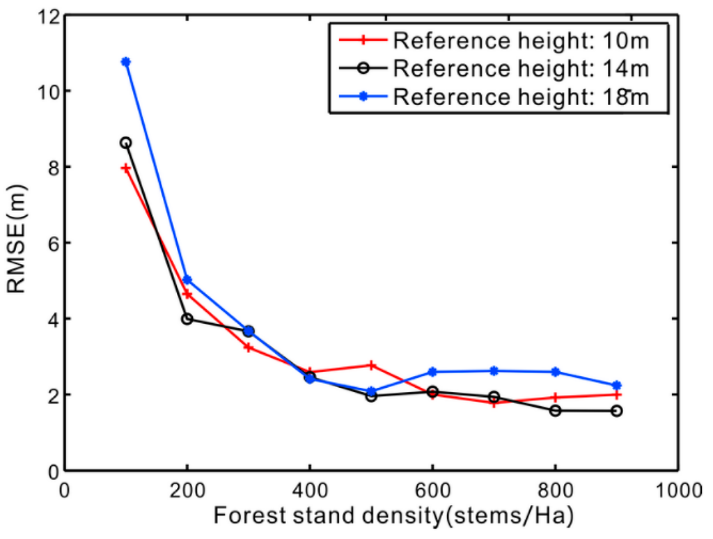 After applying the three-stage height inversion method to the simulated datasets, we acquire the root mean square error (RMSE) of inversed height for different forest stand density with a reference height of 10 m, 14 m, and 18 m. As shown in Figure 2, all the RMSEs of the three groups of results indicate an obvious decreasing trend with the increasing forest density. The decreasing RMSE indicates the increasing accuracy of forest height inversion. For the sparse forests (e.g., the stand density smaller than 400 stems/Ha), the height inversion errors become larger. The main reason is that the sparse vegetation cannot be assumed as a random volume. When forest stand density increases to a certain degree, it is no longer the main factor affecting the accuracy of forest stand height. However, there are still about 2 m of underestimated errors because the phase center of HV channel is located in the canopy rather than at the top of the forest [].